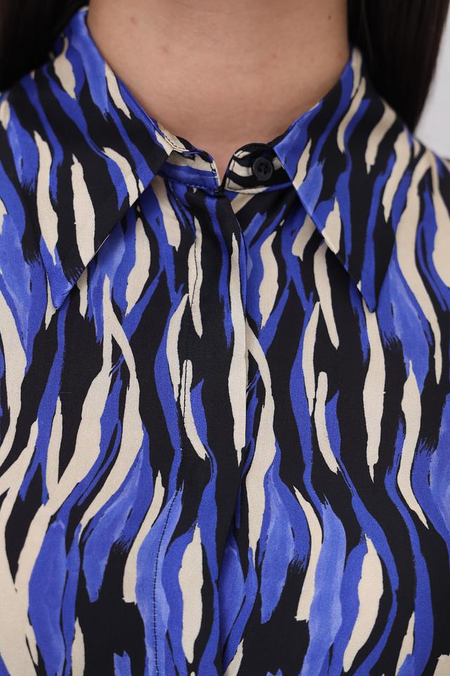 Рубашка имеет классический крой с длинными рукавами и отложным воротником. Её особенностью является яркий и необычный абстрактный принт, выполненный в синих, белых и черных тонах. Этот принт придает рубашке оригинальность и позволяет создавать стильные и запоминающиеся образы.