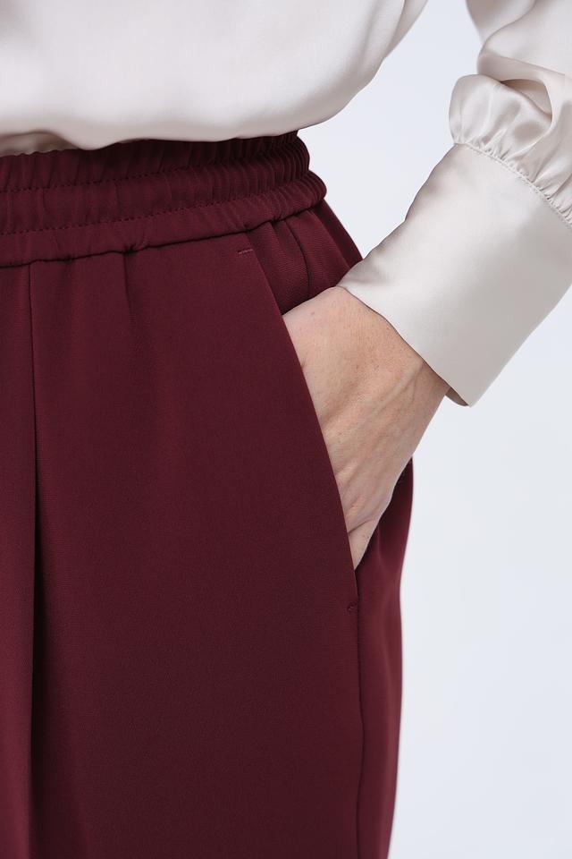 Модель отличается удобной посадкой благодаря эластичному поясу с завязками, которые позволяют регулировать облегание. Укороченный крой и аккуратные складки создают современный и лаконичный силуэт.