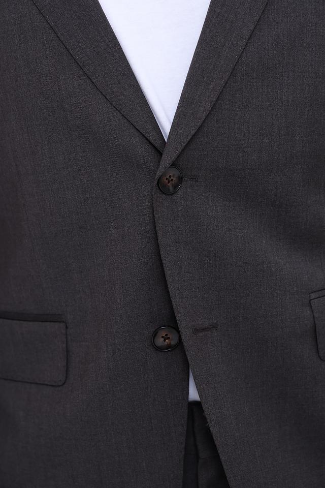 Пиджак имеет однобортную застёжку на две пуговицы, стандартные лацканы, два боковых кармана с клапанами и внутренний карман. Брюки классического кроя, зауженные к низу, с молнией и пуговицей. Костюм выполнен из высококачественной шерсти с добавлением эластана, что обеспечивает комфорт и хорошую посадку по фигуре.