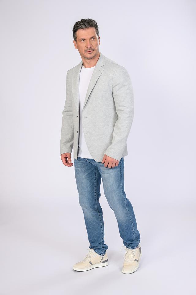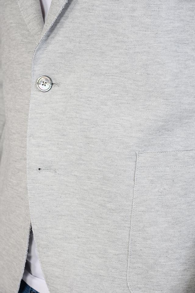 Пиджак изготовлен из высококачественного трикотажа, состоящего из 82% хлопка, 15% полиамида и 3% эластана. Это сочетание материалов обеспечивает комфорт, воздухопроницаемость и небольшую эластичность.