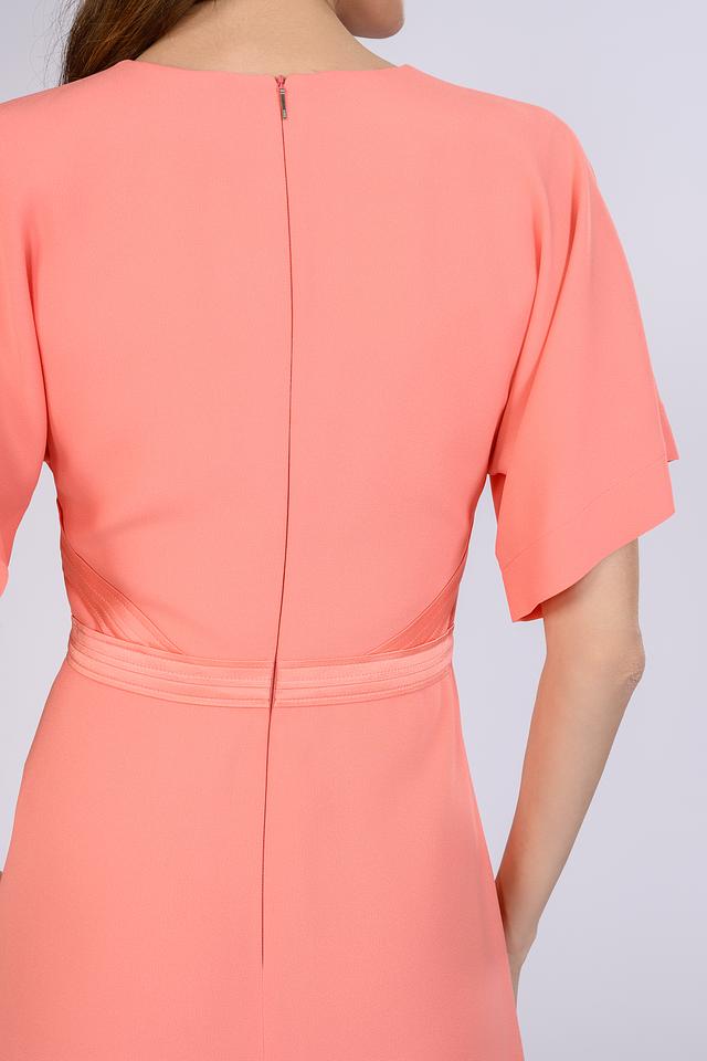 Платье Boss Black персикового цвета – элегантная модель длиной миди с V-образным вырезом и короткими рукавами. Платье выполнено из качественного ацетата и вискозы, имеет декоративную сборку на талии, подчеркивающую фигуру. Состав: ацетат 72%, вискоза 28%