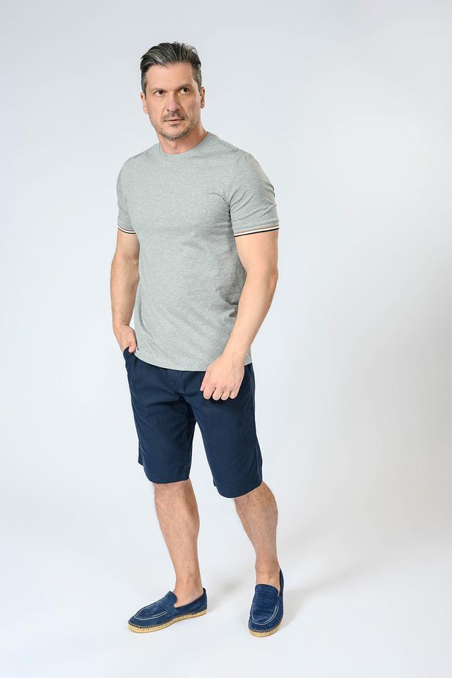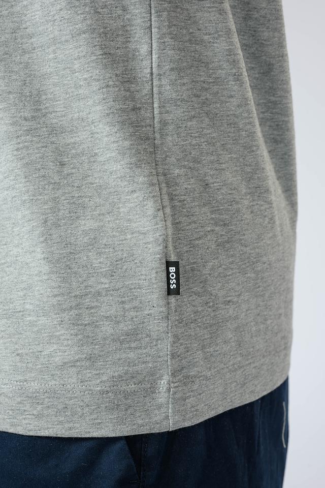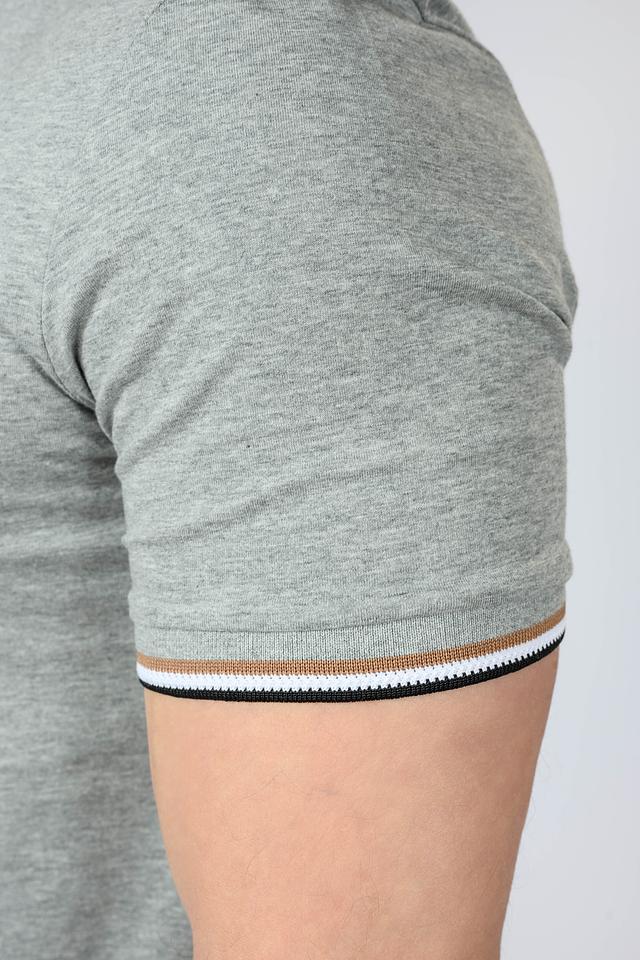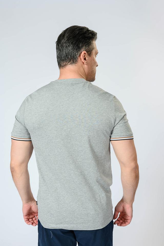 Мужская футболка Boss Black серого цвета с коротким рукавом и контрастной полоской на рукавах. Классический крой и 100% хлопковый состав обеспечивают комфорт и удобство в носке. Состав: хлопок 100%
