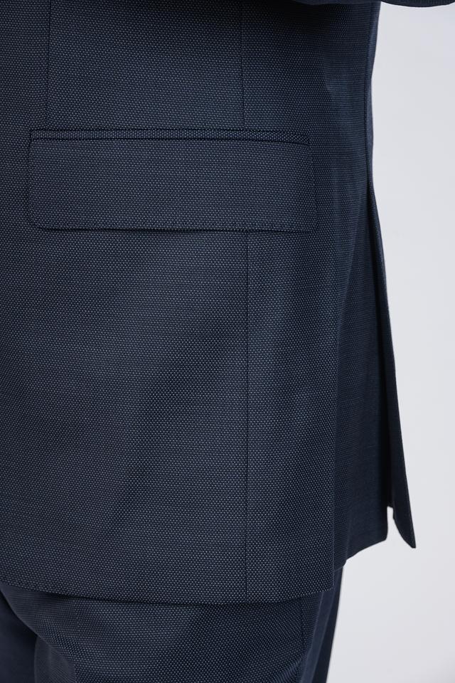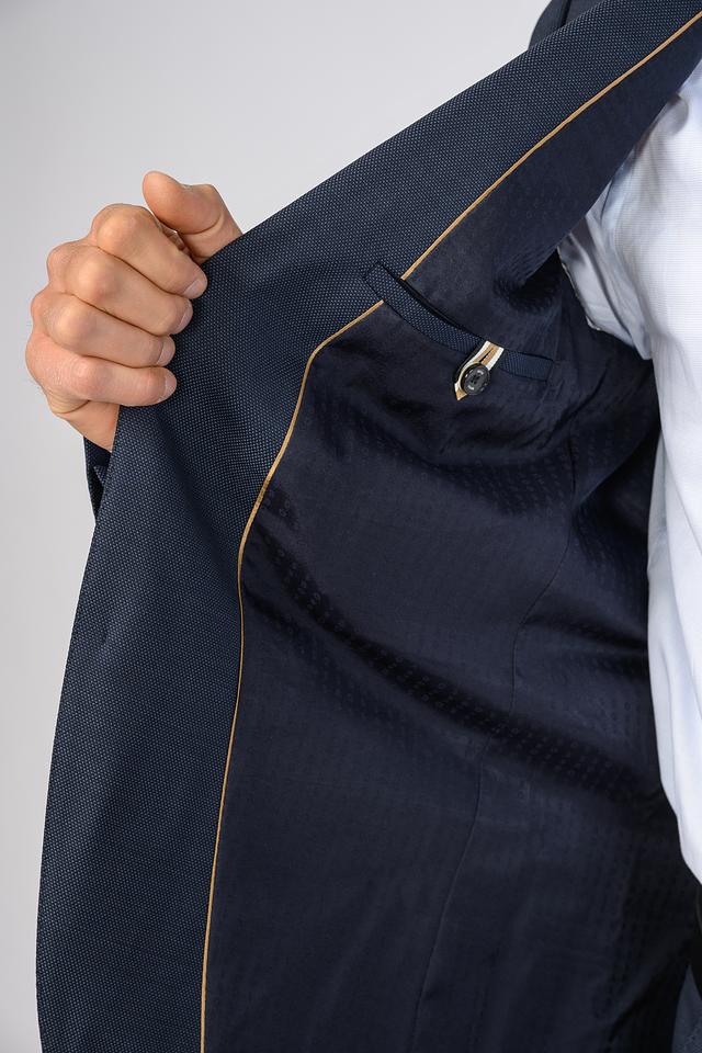 Пиджак имеет однобортную застёжку на две пуговицы, стандартные лацканы и два боковых кармана с клапанами. Подкладка пиджака выполнена из гладкой ткани с фирменным логотипом бренда. Внутренний карман обеспечивает дополнительное удобство.