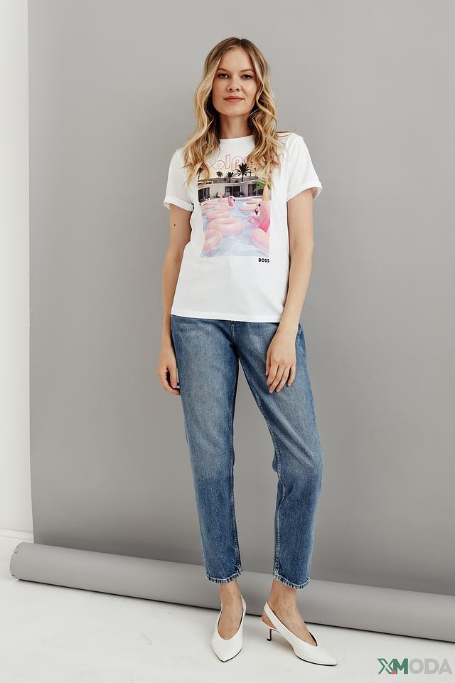 Белая футболка Boss Business с ярким летним принтом в виде бассейна и розовых фламинго. Изготовлена из 100% хлопка, обеспечивая комфорт и воздухопроницаемость. Стильный и оригинальный выбор для повседневного образа. Состав: хлопок 100%