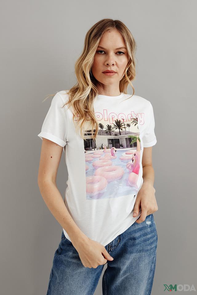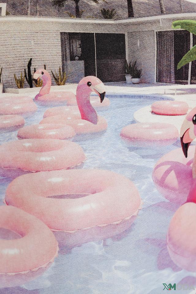 Основным элементом дизайна является красочный принт с изображением бассейна, пальм и розовых фламинго, создающий атмосферу беззаботного отдыха. Футболка имеет классический прямой крой и короткие рукава, что делает ее универсальной для различных типов фигур.