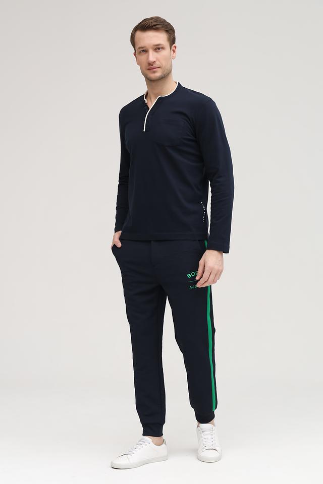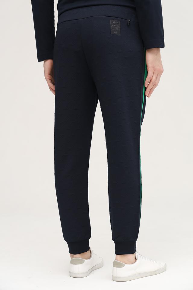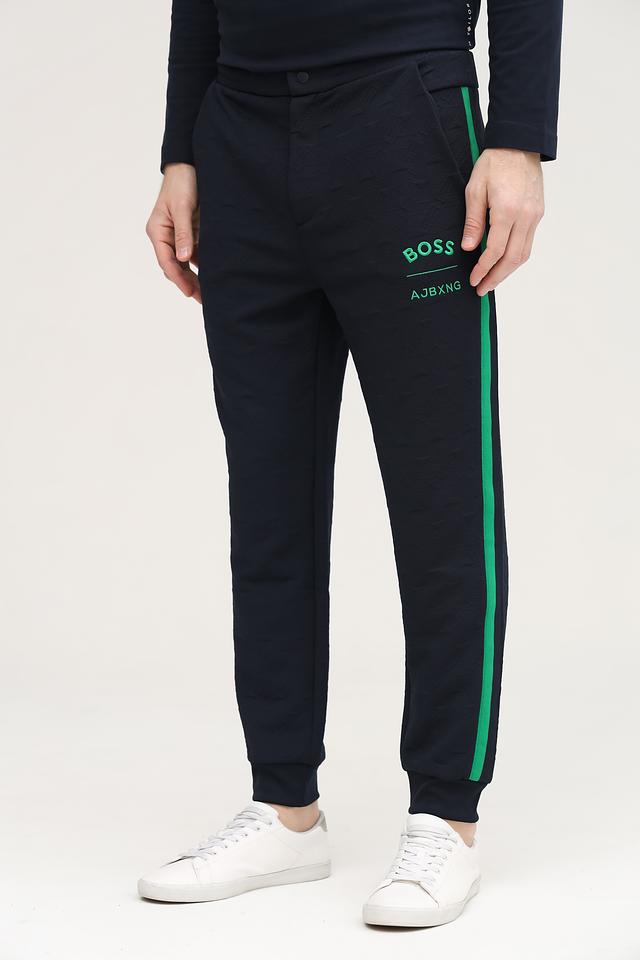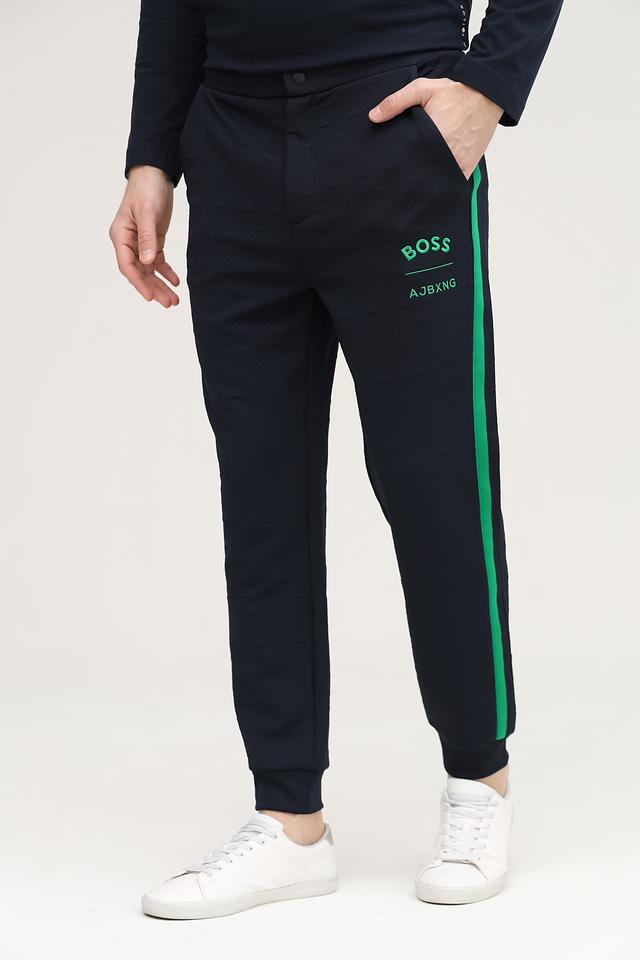 Мужские спортивные брюки Boss Green темно-синего цвета с яркой зеленой полосой по бокам. Модель выполнена из мягкого полиэстера с добавлением эластана для комфорта и свободы движений. Состав: полиэстер 97%, эластан 3%