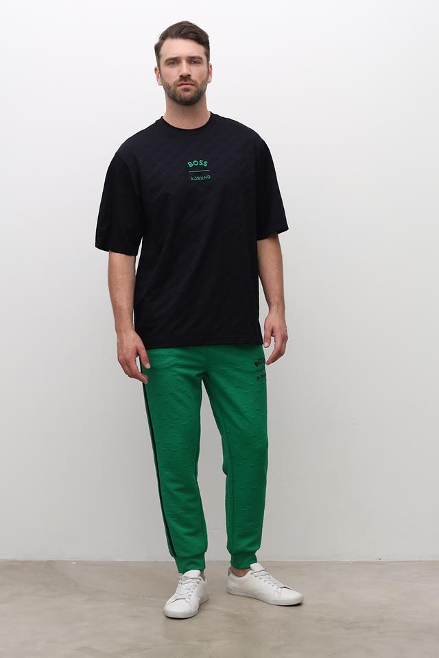 Основной цвет футболки – чёрный, а на груди расположен логотип бренда Boss Green, выполненный в зелёном цвете. Текстурированный узор добавляет изделию оригинальности и стиля.