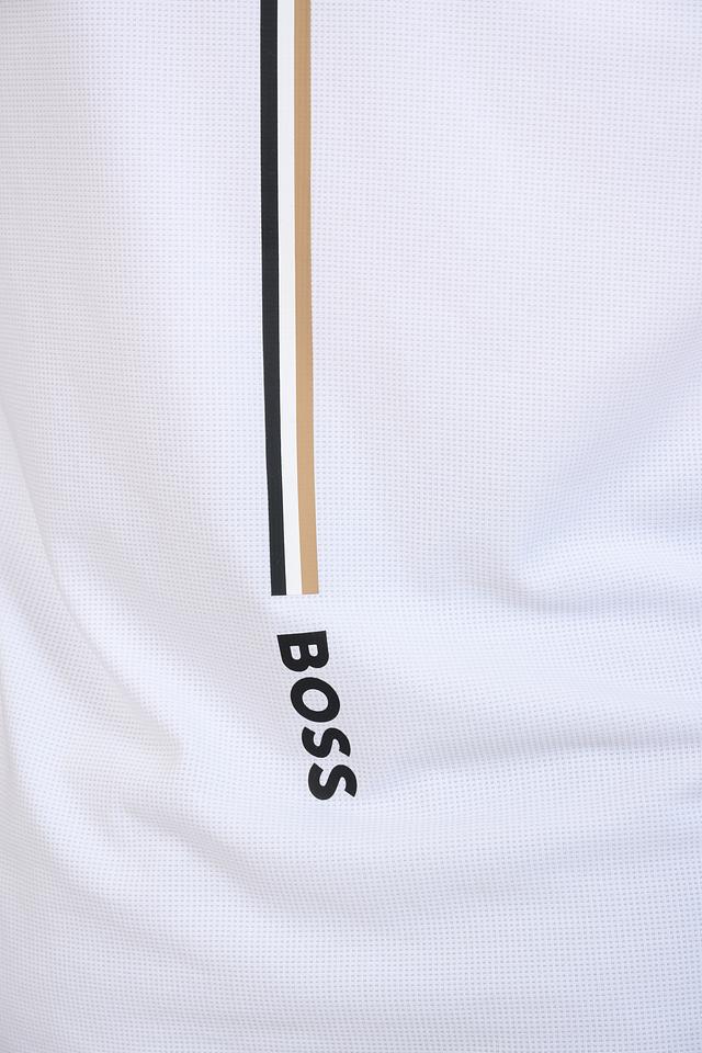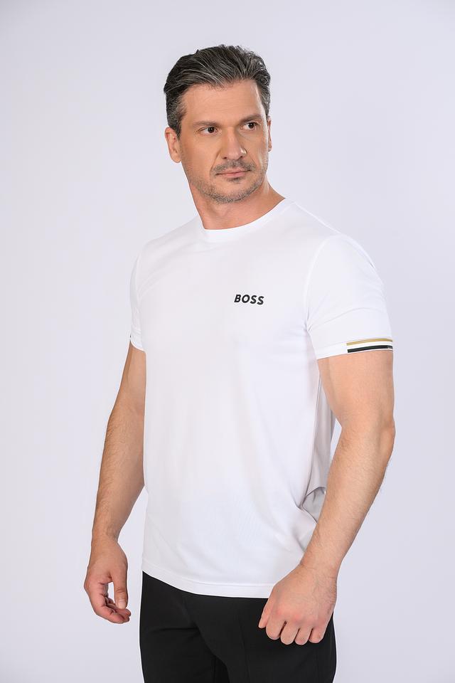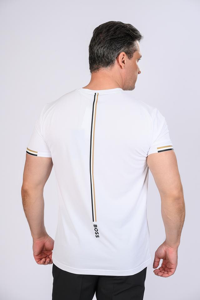 На груди футболки расположен логотип бренда Boss, выполненный в чёрном цвете, что придает ей узнаваемый и стильный вид. Дополнительным акцентом является полоска на рукаве, сочетающая в себе чёрный, золотистый и белый цвета.