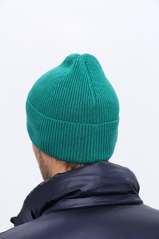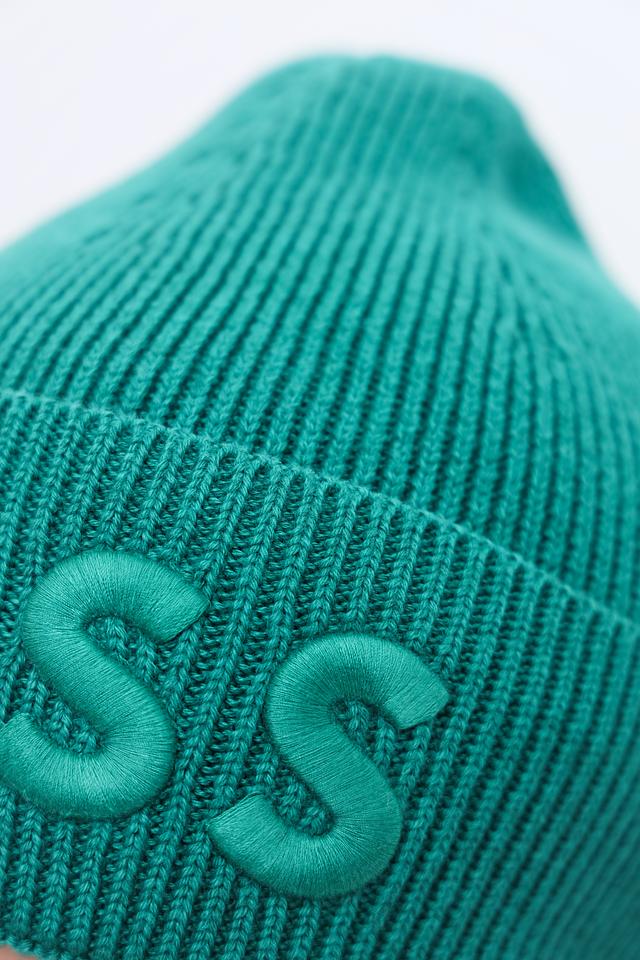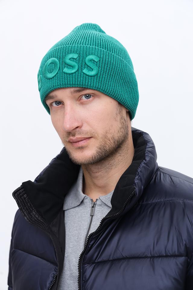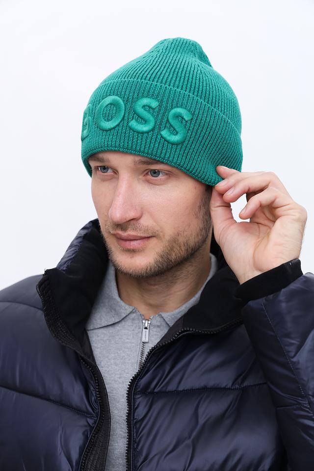 Шапка имеет классический дизайн и насыщенный зелёный цвет. Особый акцент сделан на крупной вышивке логотипа бренда "BOSS" на лицевой стороне, что придает шапке узнаваемый и стильный вид.