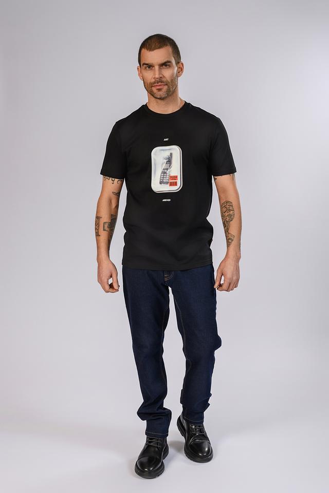 Основным элементом дизайна является яркий принт на передней части, изображающий смартфон в прозрачной упаковке с надписями “JUST ARRIVED” и символом “FRAGILE”. Этот принт добавляет футболке оригинальности и современного стиля.