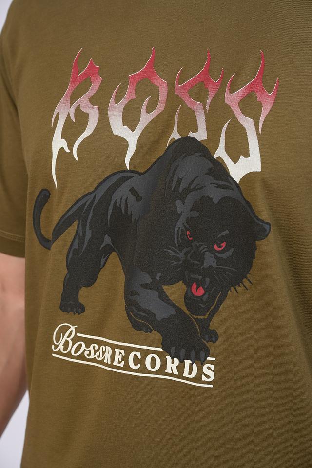 Мужская футболка Boss Orange оливкового цвета с эффектным принтом в виде пантеры. Изготовлена из 100% хлопка, обеспечивающего комфорт и воздухопроницаемость. Стильный и современный выбор для повседневного гардероба. Состав: хлопок 100%