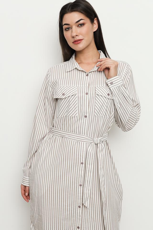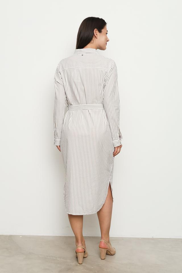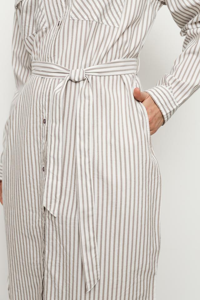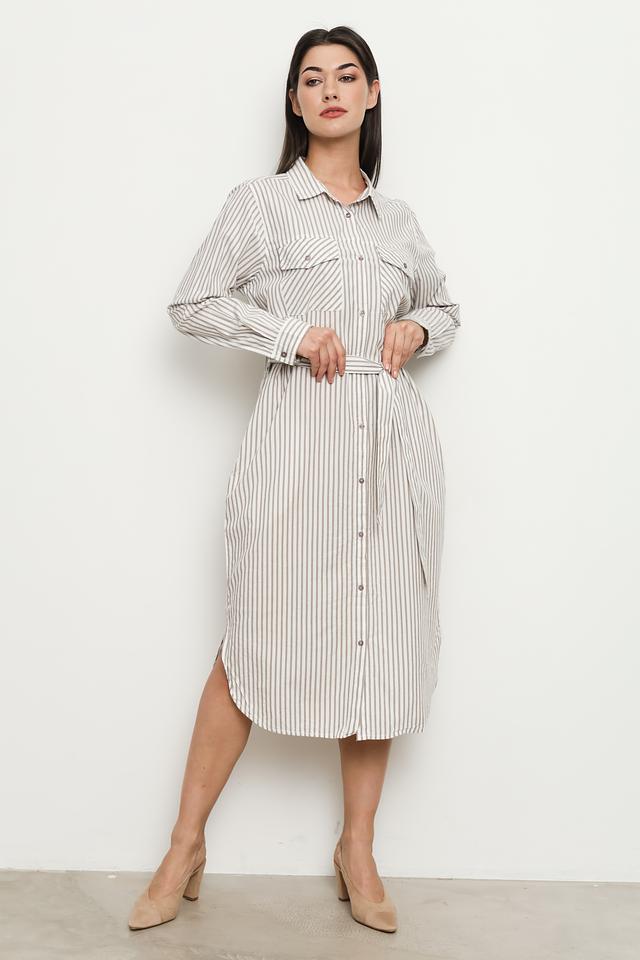 Платье от Broadway в светлую полоску – стильное и комфортное решение для повседневного образа. Модель выполнена из хлопка с вискозой, имеет рубашечный крой, длинный рукав и пояс. Состав: хлопок 55%, вискоза 45%