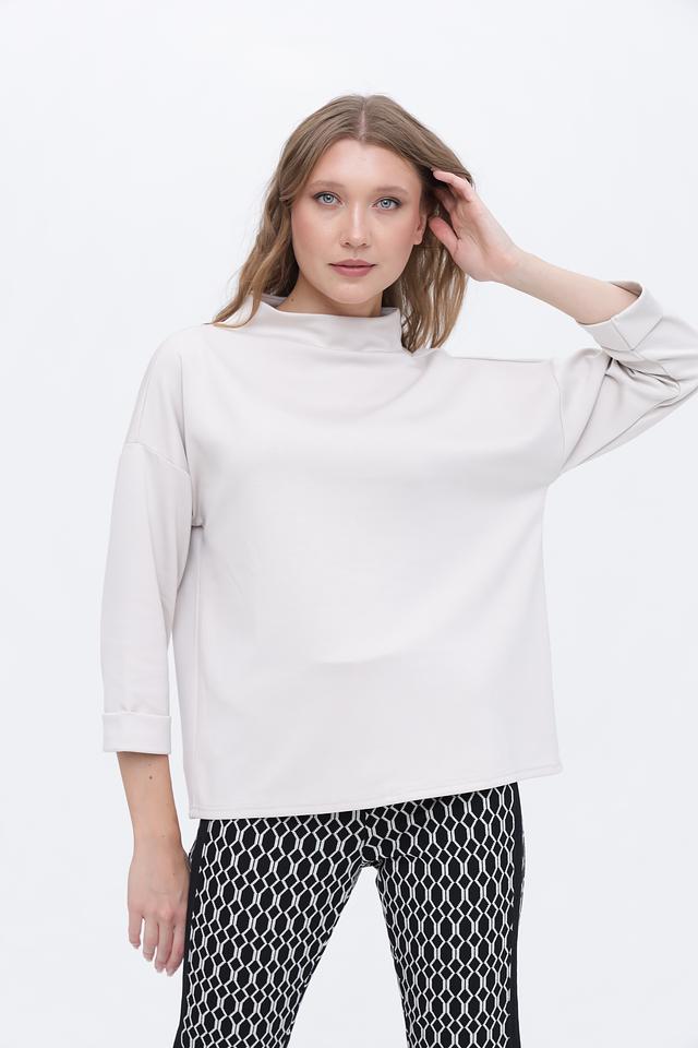 Модель имеет удобный крой с рукавом 3/4 и воротником-стойкой, что делает его универсальным для создания как повседневных, так и более элегантных образов. Ткань пуловера состоит из полиэстера, вискозы и эластана, что обеспечивает комфорт при носке, хорошую посадку по фигуре и устойчивость к деформации.