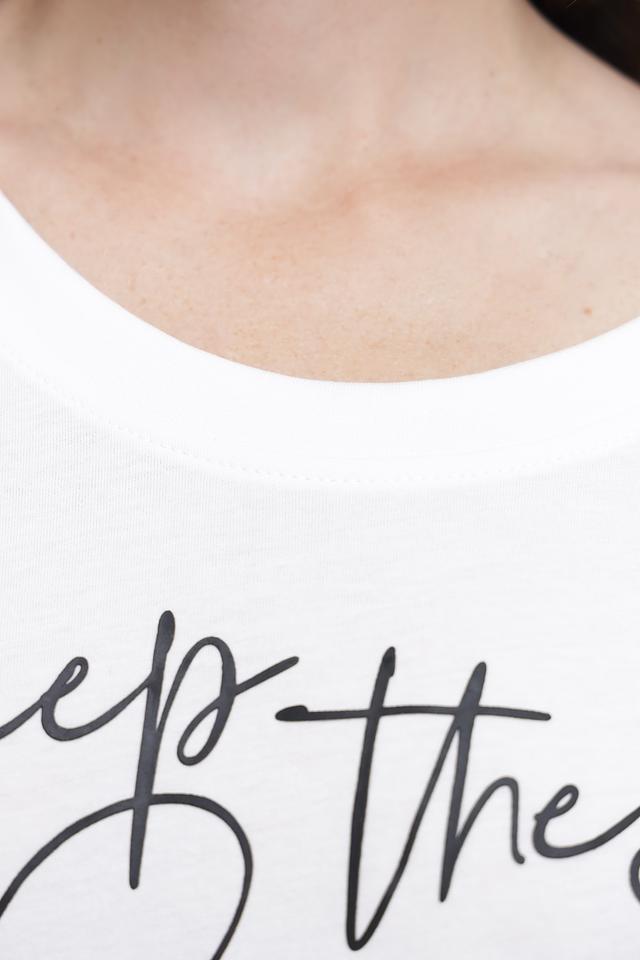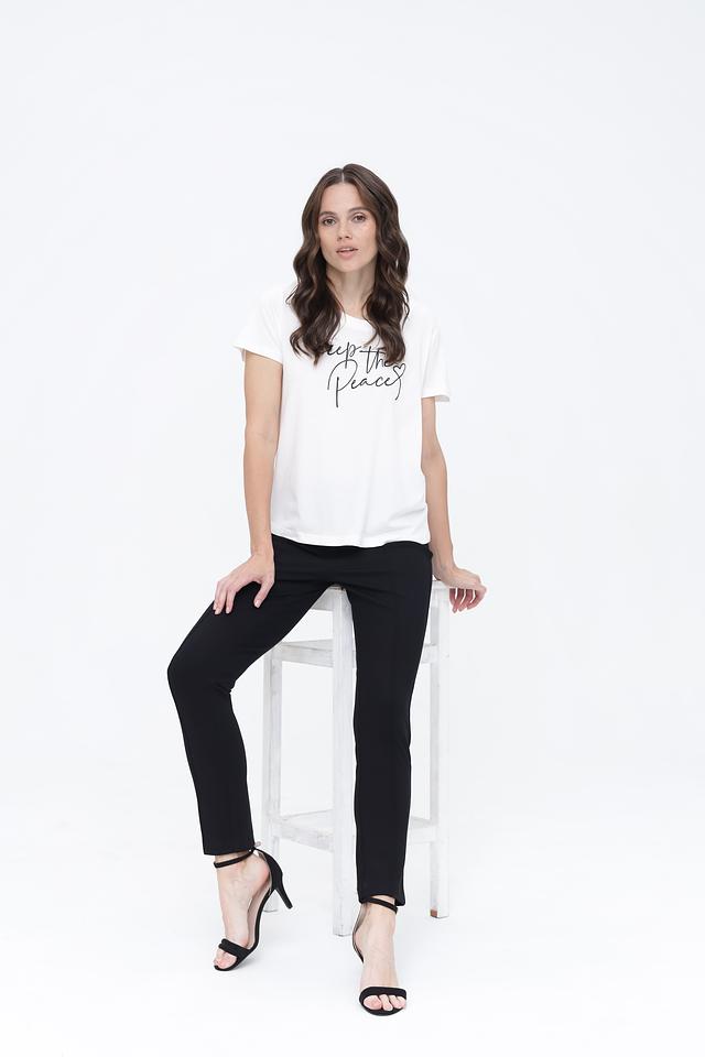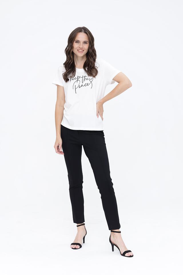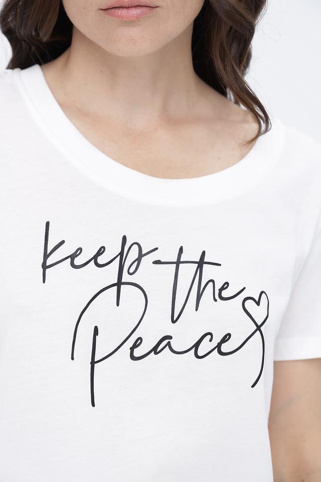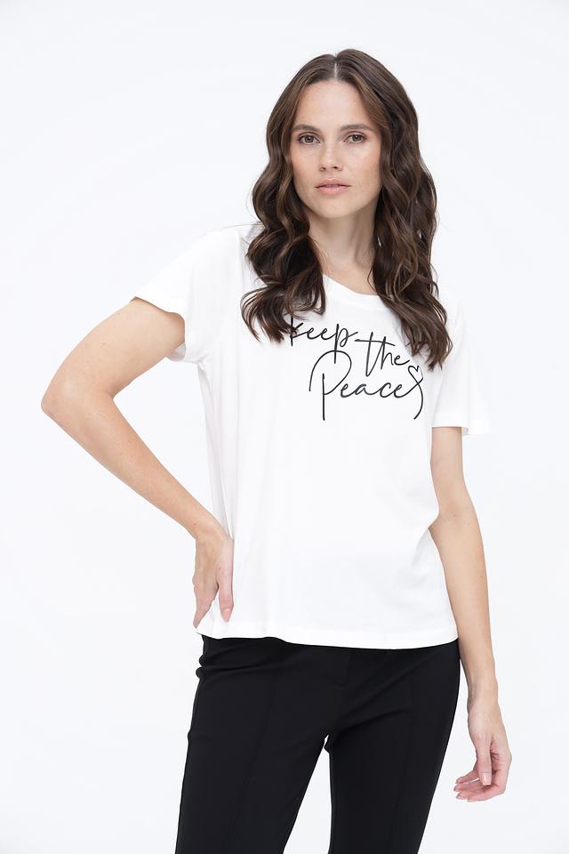Модель имеет прямой крой, который не сковывает движений, и короткие рукава. Футболка украшена стильным чёрным принтом с надписью "Keep the Peace", добавляющим образу индивидуальность.