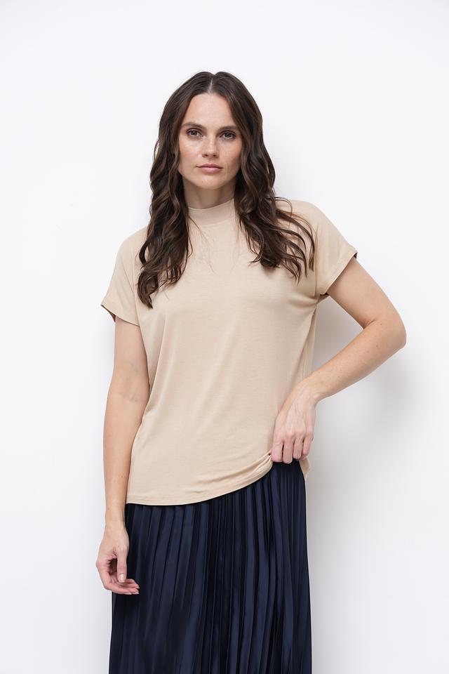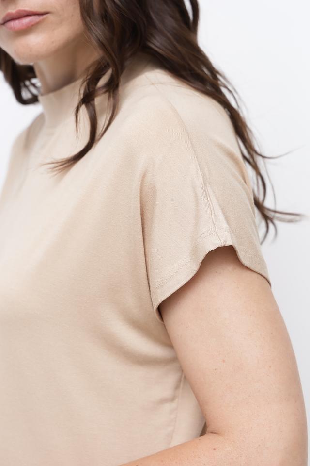 Футболка имеет прямой крой и короткий рукав, а также округлый вырез горловины. Бежевый цвет делает ее универсальной и легко сочетаемой с различными элементами одежды.