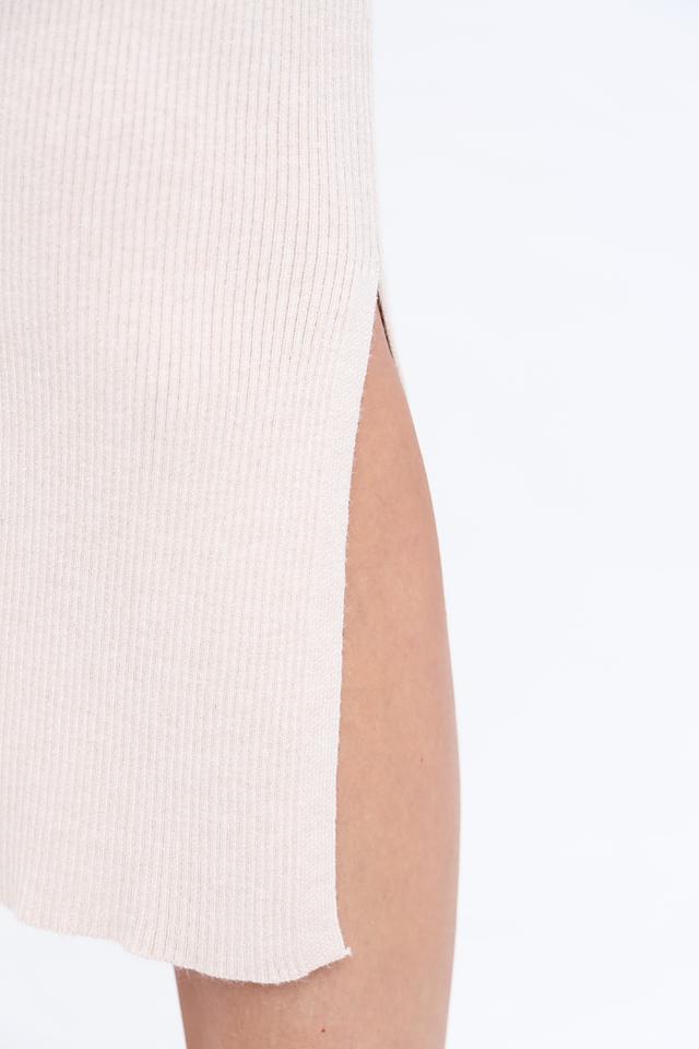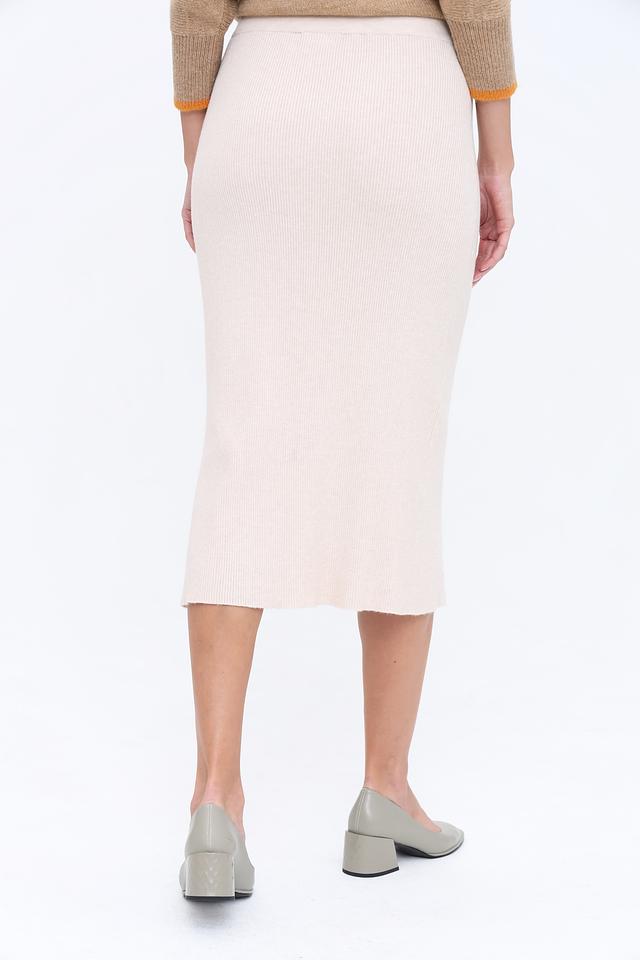 Юбка имеет классический бежевый цвет, который легко сочетается с различными элементами одежды. Трикотажная текстура добавляет изделию мягкости и уюта. Модель выполнена с разрезом сзади, что придает ей более современный и динамичный вид.