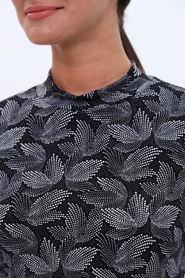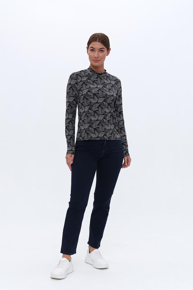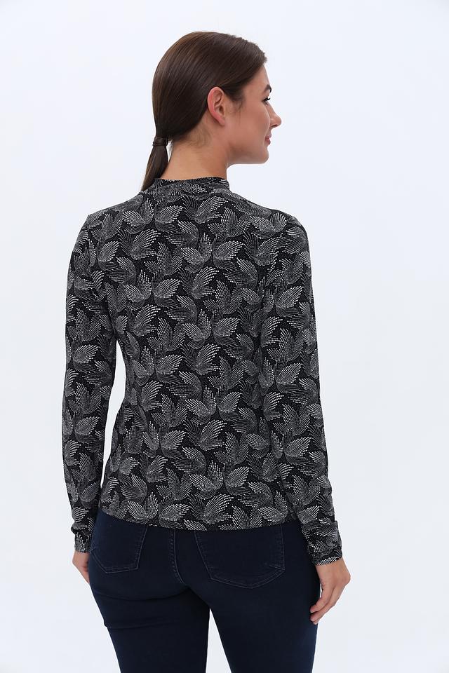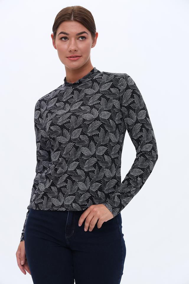 Основной цвет водолазки – чёрный, а её поверхность покрыта стильным принтом, изображающим листья. Принт выполнен в оттенках белого и серого, создавая интересный контраст.