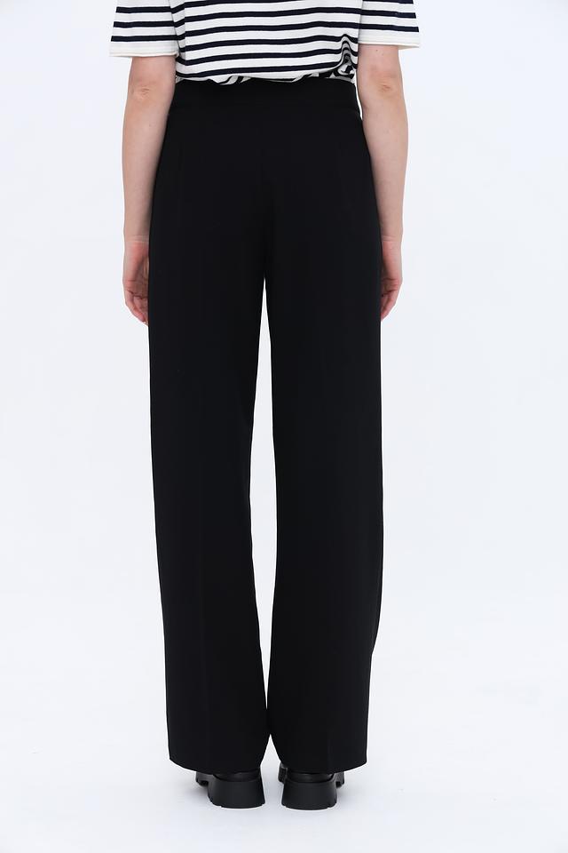 Особенности модели: высокая посадка, широкие штанины, классический чёрный цвет, удобная застежка.