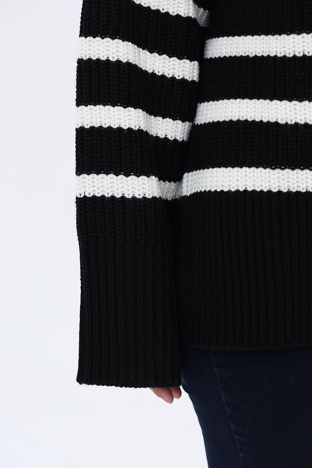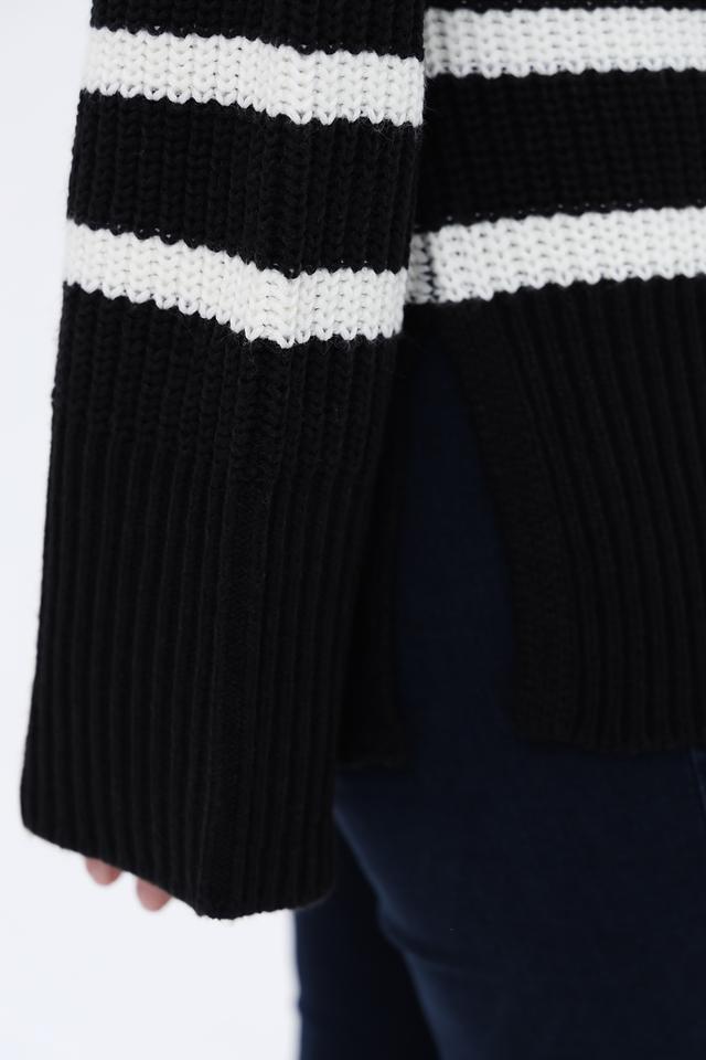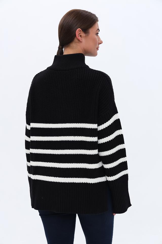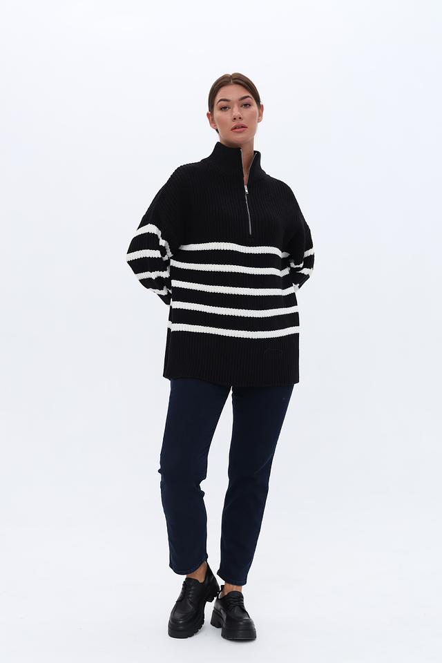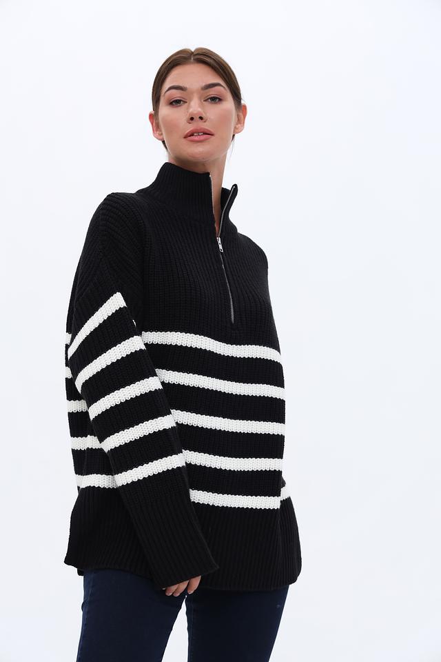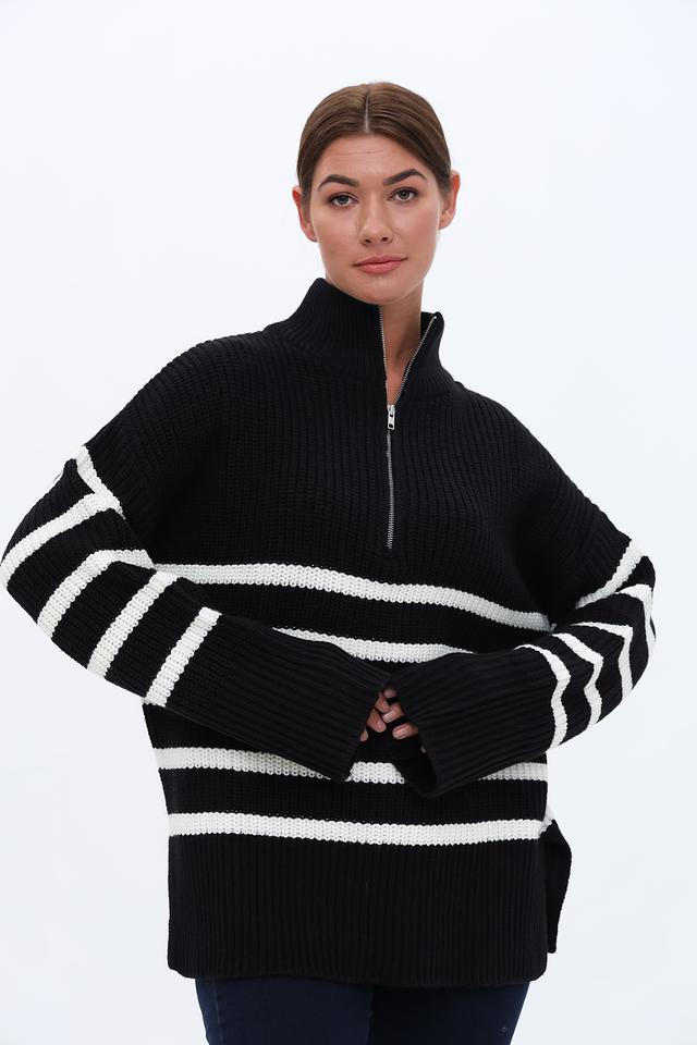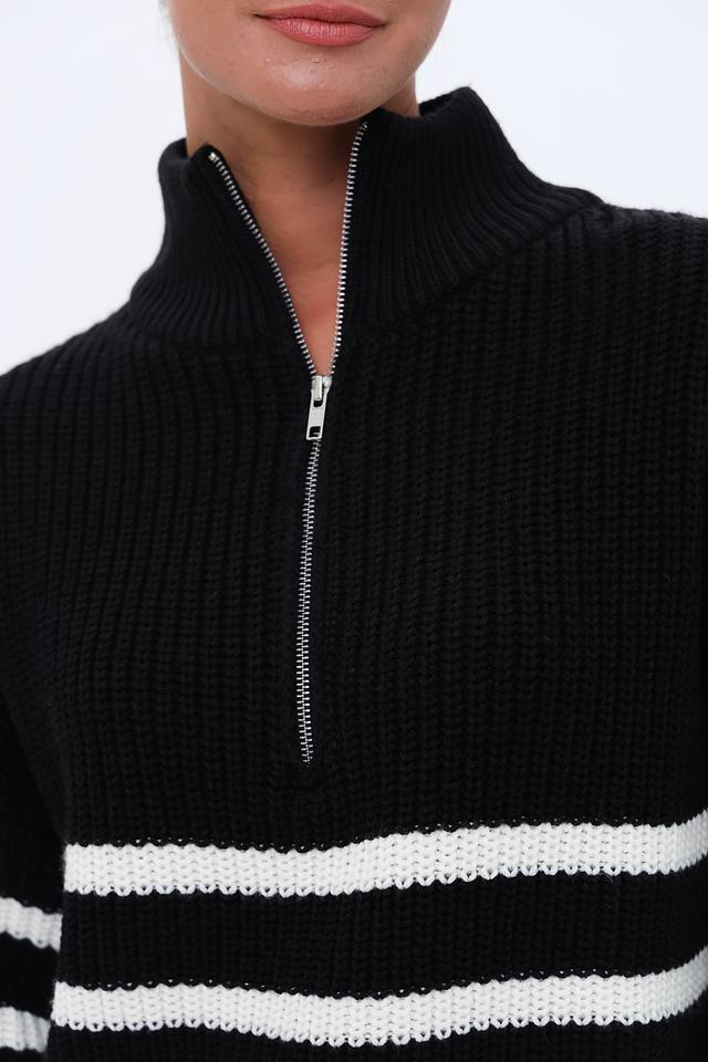 Чёрный пуловер от Broadway с белыми полосами и застёжкой-молнией на горловине. Изготовлен из мягкого акрила и хлопка, обеспечивающих комфорт и удобство в носке. Стильный и универсальный выбор для создания модных образов. Состав: акрил 69%, хлопок 31%