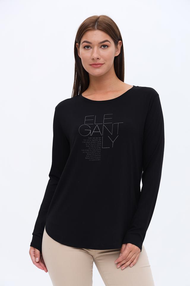 Лонгслив имеет прямой крой и удобную посадку по фигуре. На лицевой стороне расположен эффектный принт с надписью "ELEGANTLY", выполненный в контрастных тонах. Длинные рукава обеспечивают дополнительное тепло в прохладную погоду.