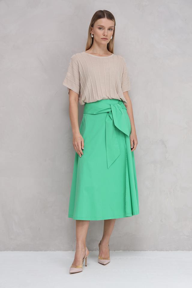 Особенностью модели является вертикальная вязка, которая визуально вытягивает силуэт и добавляет текстуру. Круглый вырез горловины подчеркивает элегантность изделия.