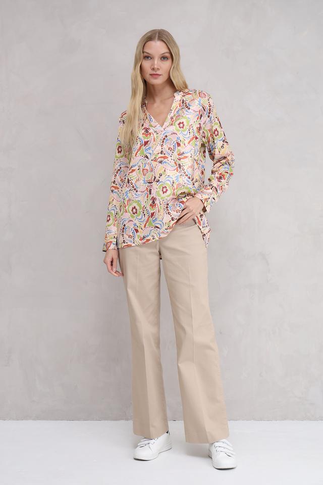 Блуза имеет свободный крой, который не сковывает движений и позволяет создать расслабленный образ. V-образный вырез горловины добавляет изящества, а длинные рукава делают её подходящей для прохладной погоды.