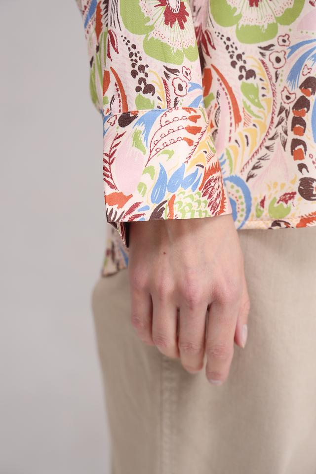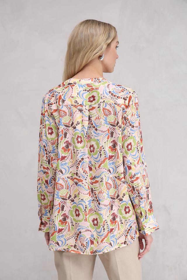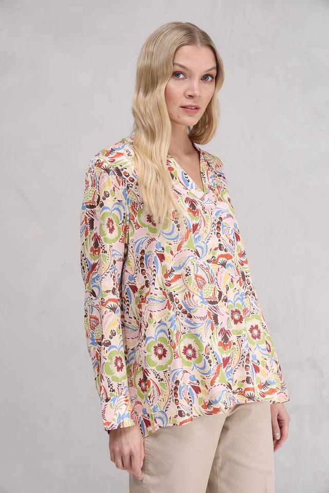 Особенностью этой блузы является её яркий и красочный цветочный принт, который состоит из множества оттенков: зелёного, голубого, оранжевого, коричневого и розового. Такой рисунок делает блузу уникальной и привлекательной. Состав ткани: 55% полиэстер, 45% вискоза.