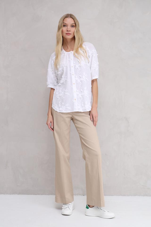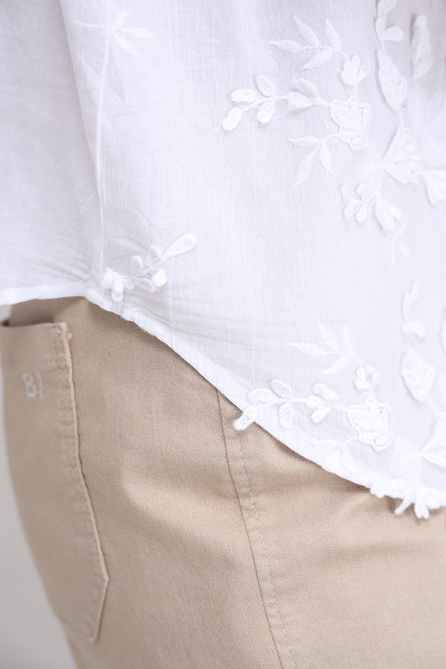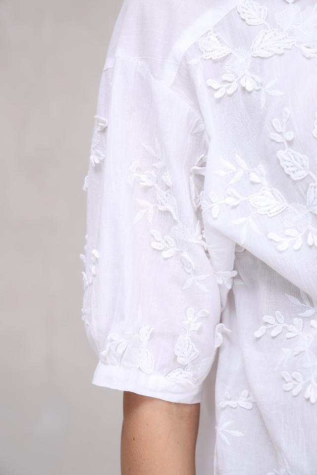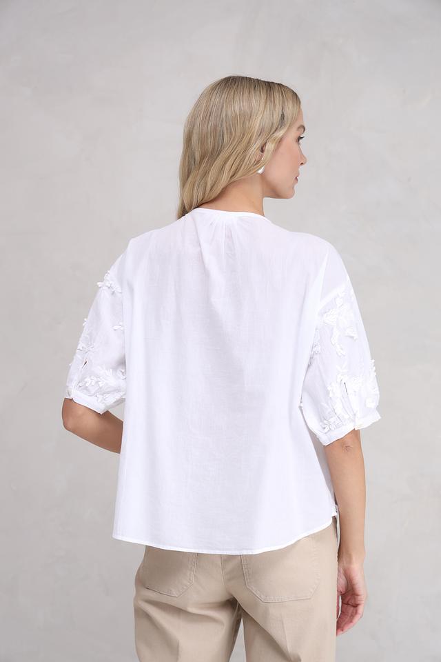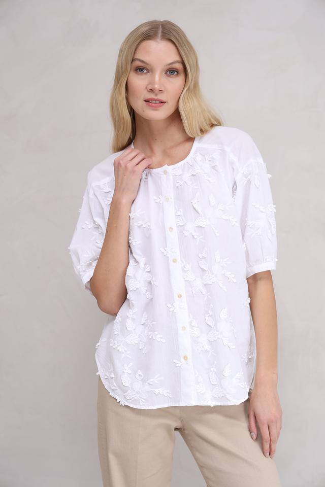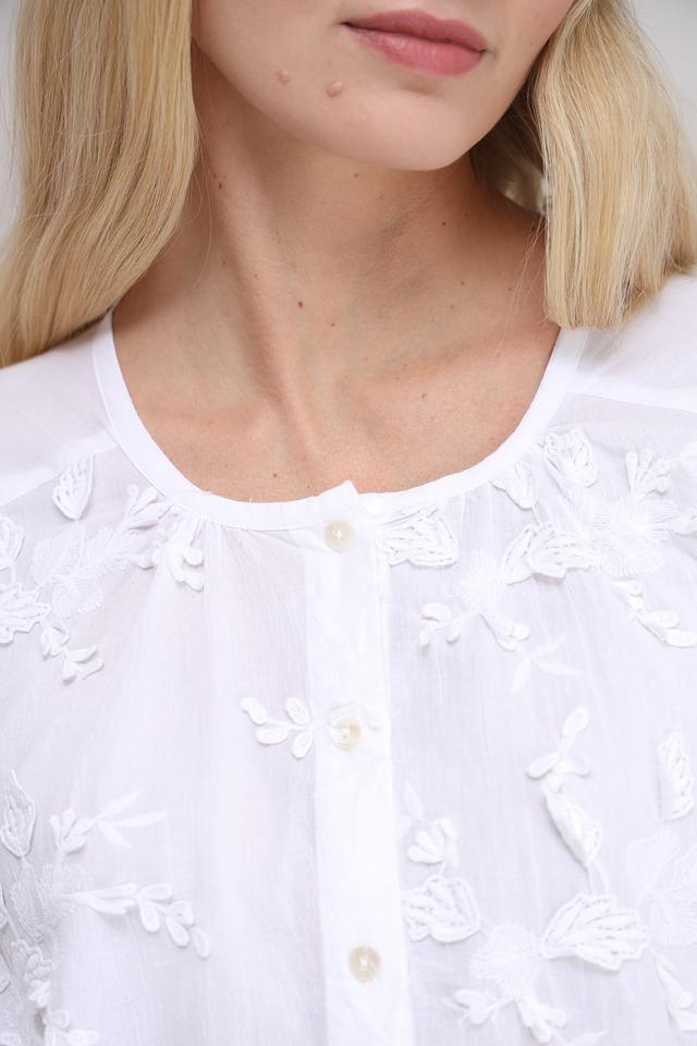Особенностью модели является деликатная вышивка в виде цветов, которая придает ей романтичный и женственный вид. Блуза имеет округлый вырез горловины и короткие рукава, украшенные вышивкой.