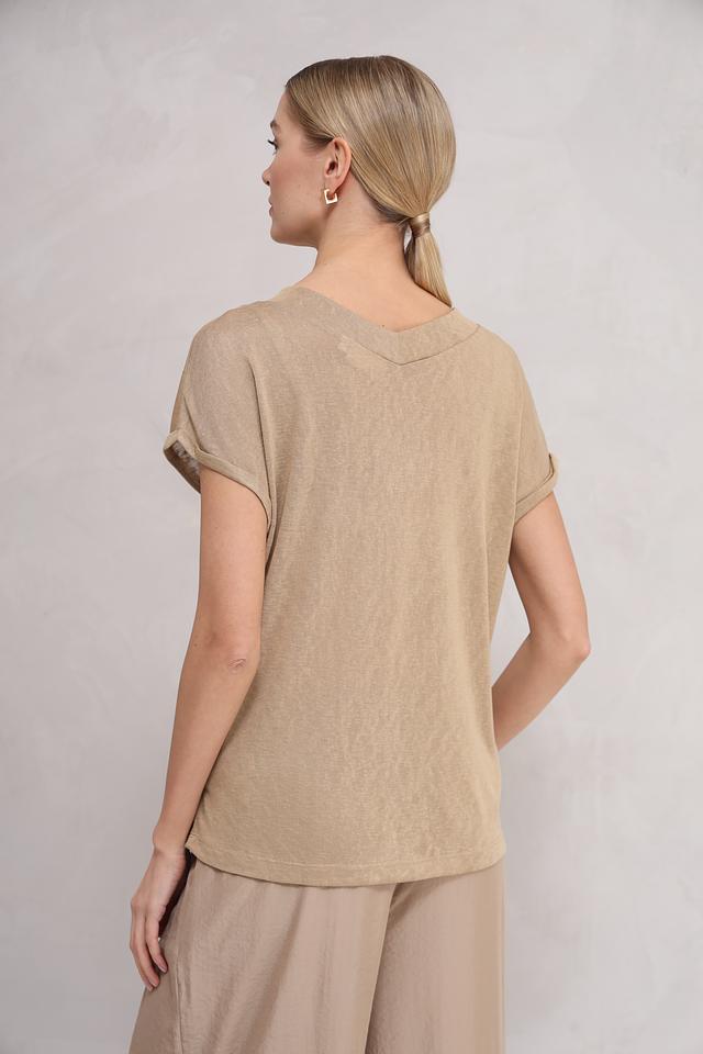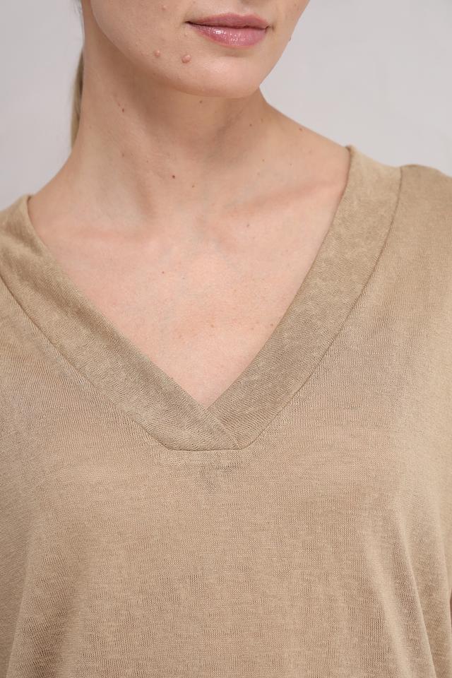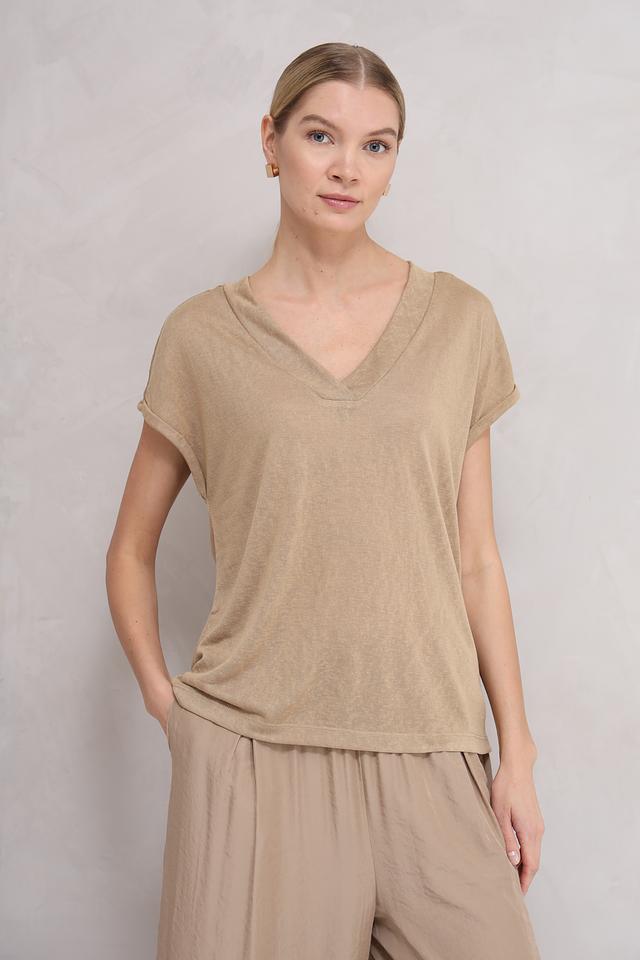 Топ имеет классический V-образный вырез, который визуально удлиняет шею и подчеркивает линию декольте. Короткие рукава делают его идеальным выбором для теплой погоды. Свободный крой обеспечивает комфорт и свободу движений.