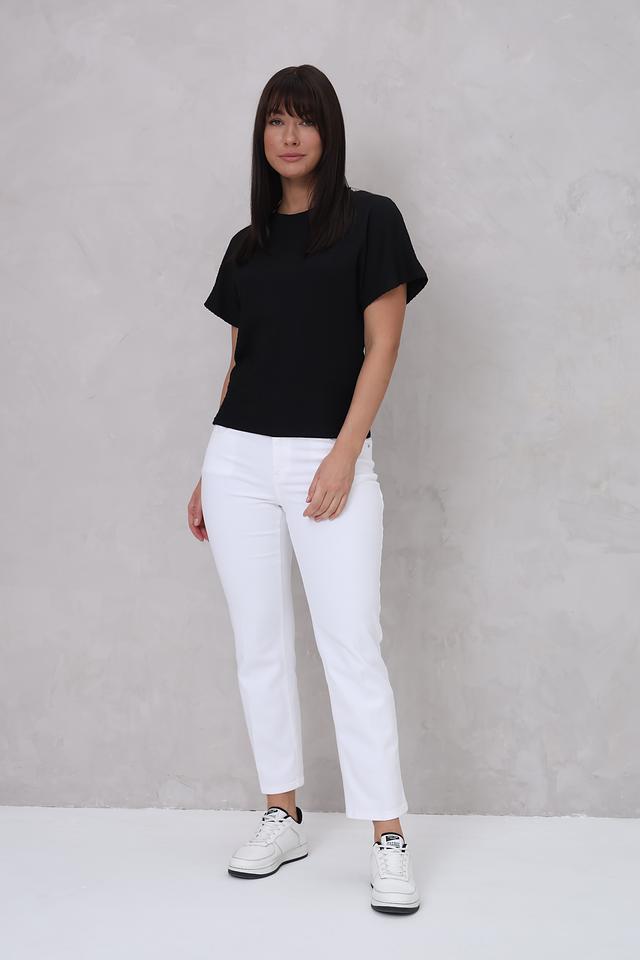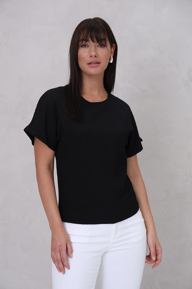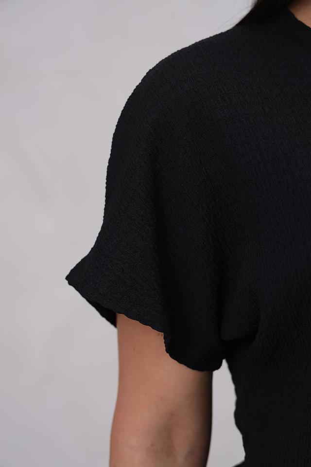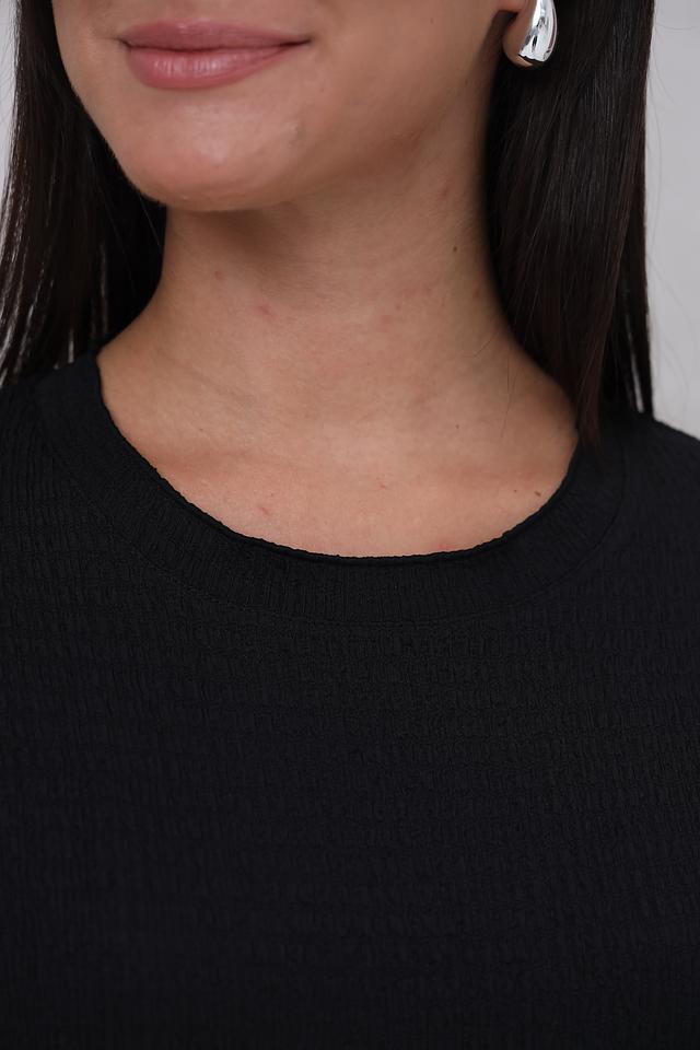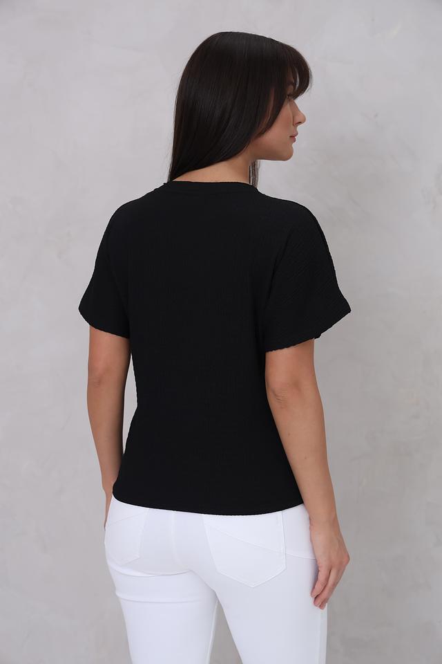 Футболка имеет классический чёрный цвет и текстурированную поверхность, что придает ей особый шарм. Короткий рукав-фонарик добавляет образу женственности и лёгкости. Круглый вырез горловины делает модель универсальной и подходящей для различных стилей.