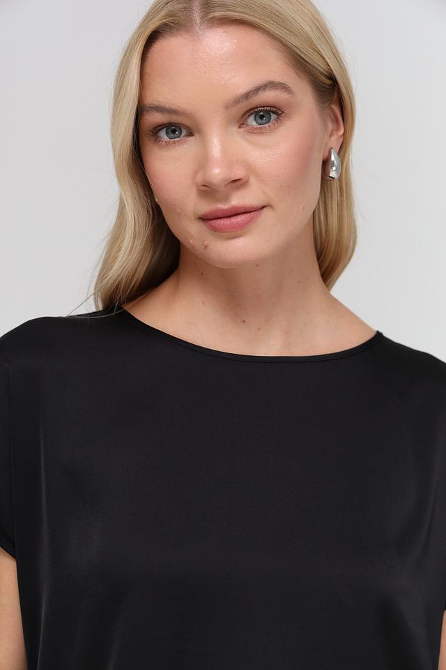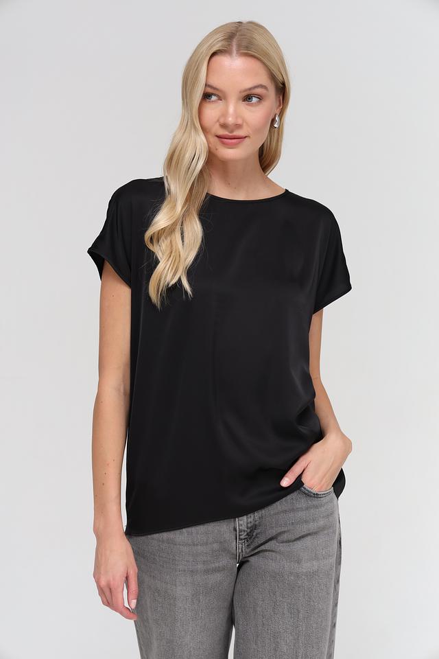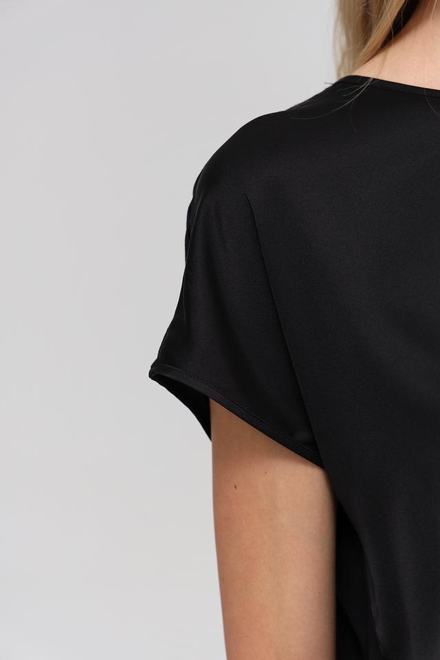 Блуза имеет прямой крой, который обеспечивает комфортную посадку по фигуре. Короткие рукава делают её идеальным выбором для тёплой погоды. Округлый вырез горловины добавляет образу женственности.