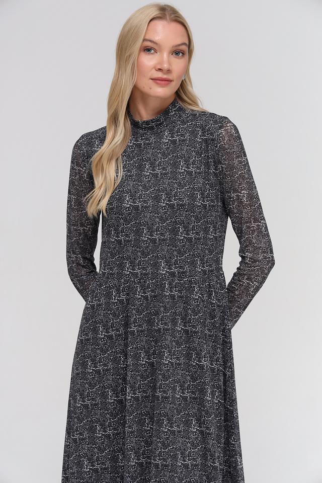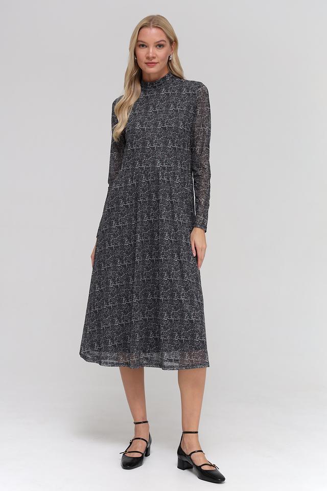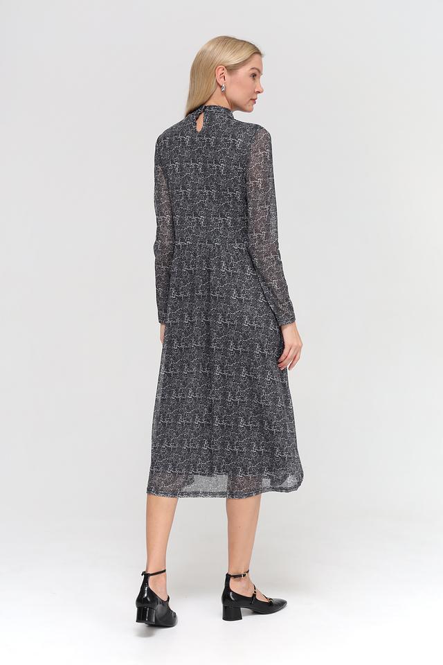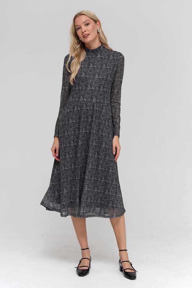 Платье имеет длину миди, длинные рукава и высокий воротник-стойку. Крой платья слегка приталенный, с юбкой трапециевидной формы, что обеспечивает комфортную посадку по фигуре. Изготовлено из полиэстера с добавлением эластана, что делает его приятным к телу и устойчивым к сминанию.