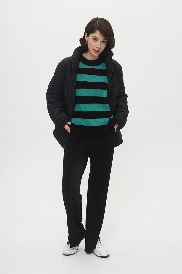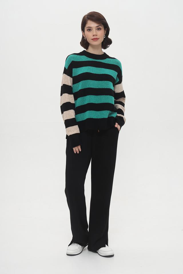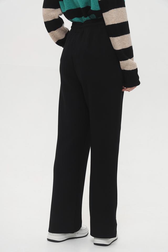 Брюки имеют завышенную талию и эластичный пояс на шнуровке, обеспечивающие удобную посадку по фигуре. Клёш от колена придает образу ретро-шарм и визуально удлиняет ноги.