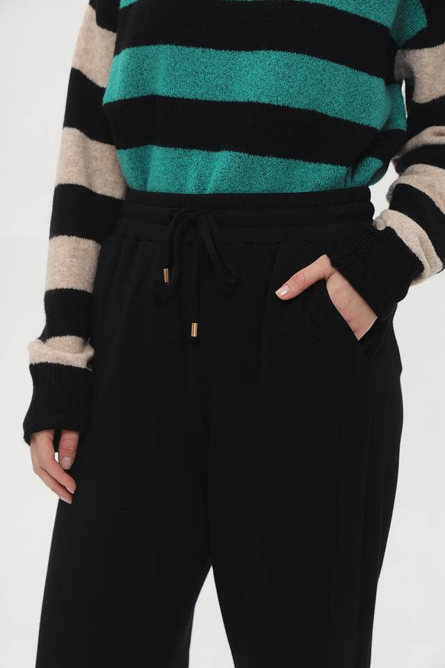 Чёрные брюки от Broadway клёш с завышенной талией и эластичным поясом на шнуровке. Модель выполнена из мягкой ткани с добавлением вискозы и эластана для комфорта и свободы движений. Состав: полиэстер 57%, вискоза 38%, эластан 5%