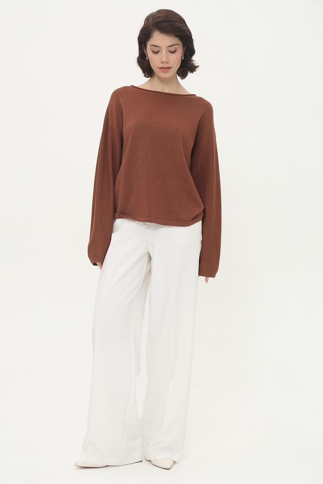 Пуловер имеет свободный крой, округлый вырез горловины и длинные рукава. Благодаря своему лаконичному дизайну, он легко сочетается с различными элементами одежды – от классических брюк до джинсов.