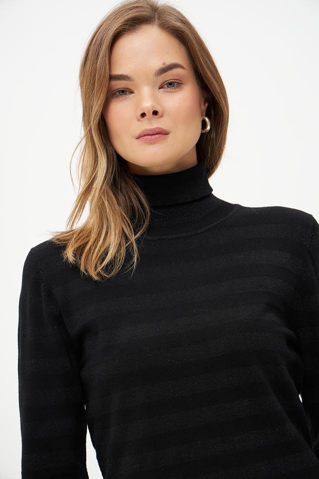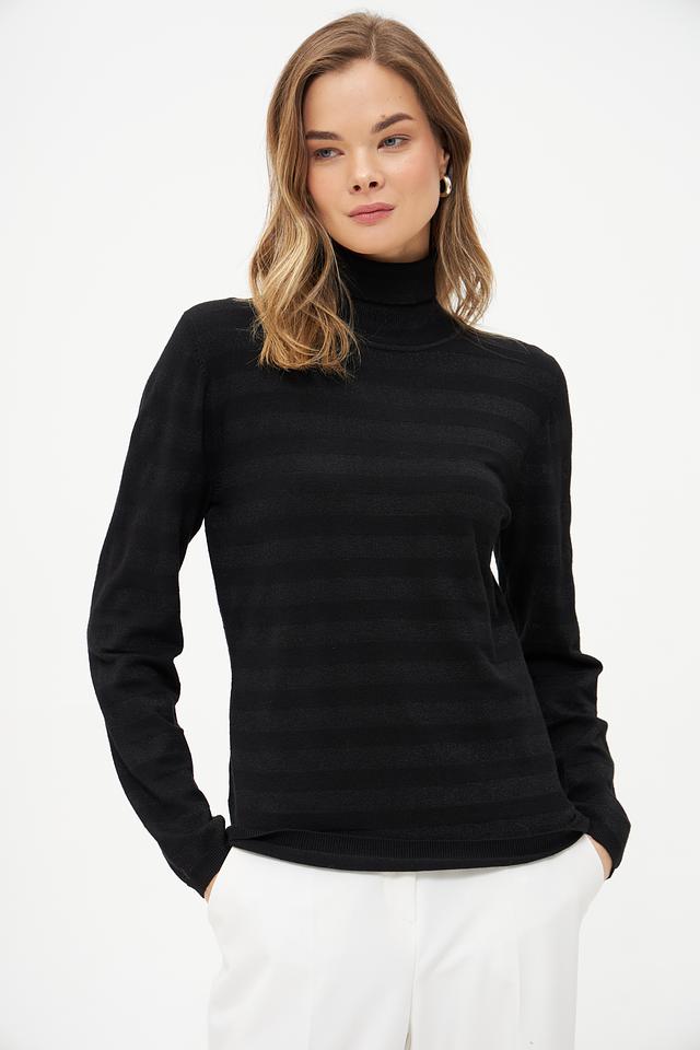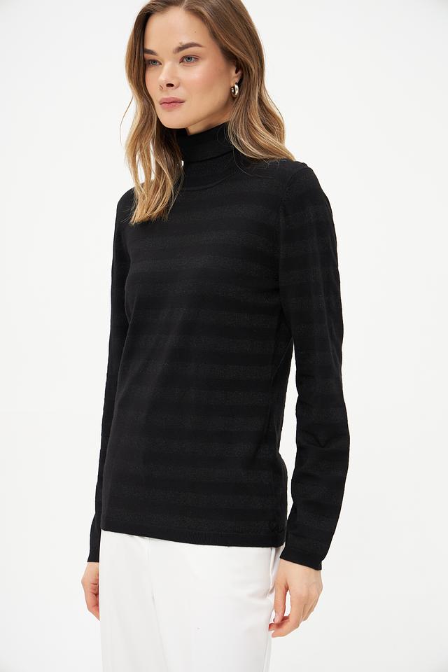 Чёрная водолазка от Broadway выполнена из мягкого трикотажа с деликатным узором. Состав включает вискозу, полиамид и металлизированную нить, что придает изделию особый блеск и комфорт. Состав: вискоза 65%, полиамид 29%, метализ.нить 6%