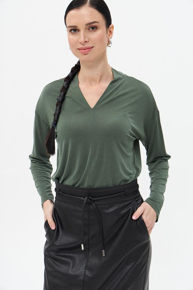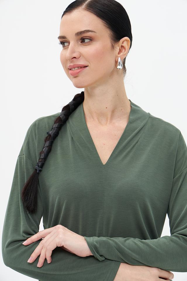 Женская футболка Broadway хаки цвета с V-образным вырезом и длинными рукавами. Изготовлена из мягкого и приятного к телу модала с добавлением полиэстера, обеспечивающего комфорт и износостойкость. Состав: модал 64%, полиэстер 36%