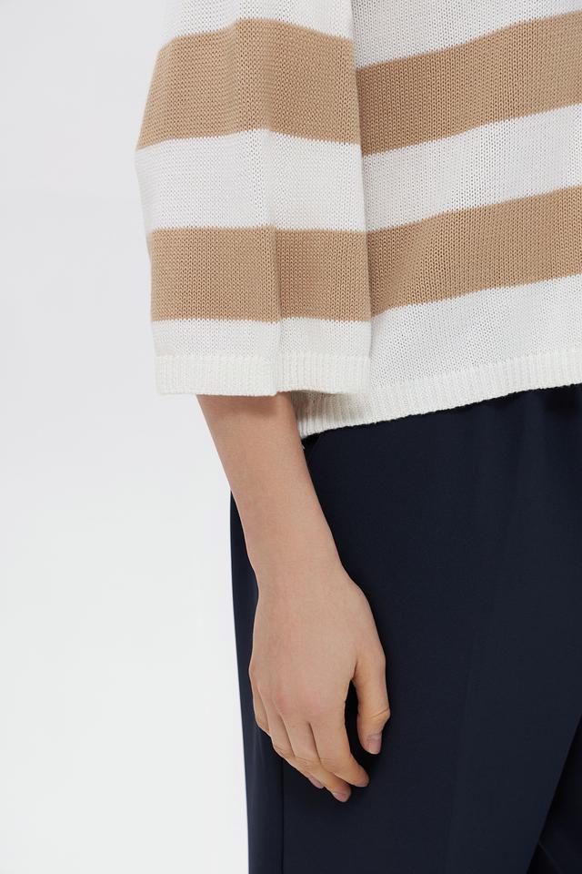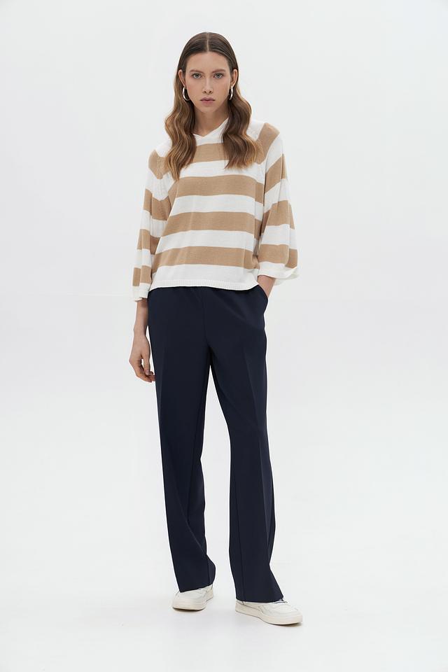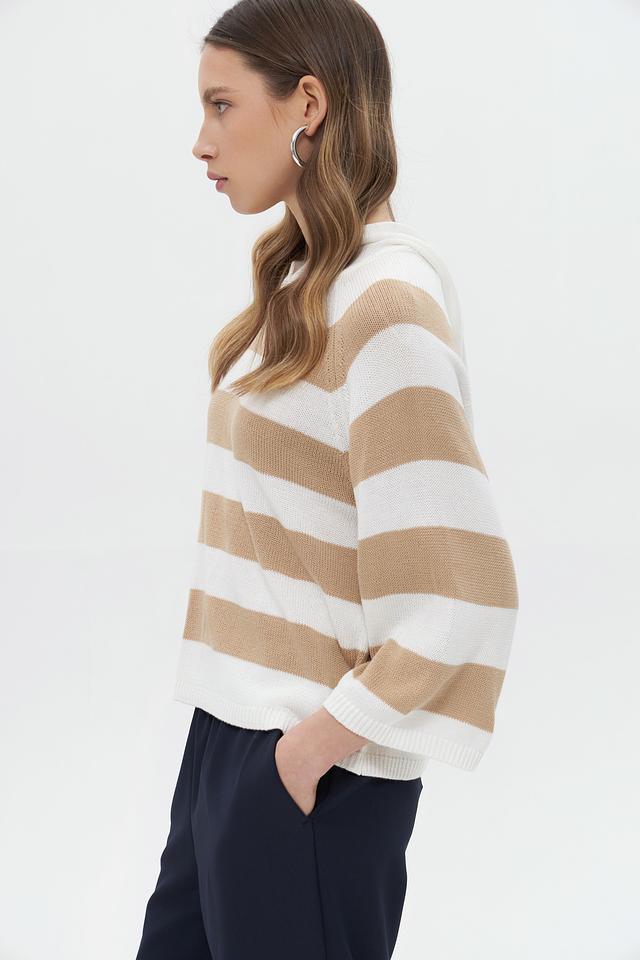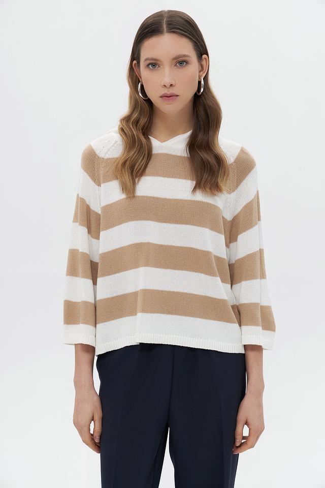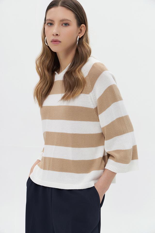 Женский пуловер Broadway бежевого цвета с полоской – это стильная и комфортная модель на каждый день. Пуловер имеет удобный V-образный вырез и рукава 3/4, выполнен из мягкого и приятного к телу сочетания хлопка и акрила. Состав: хлопок 50%, акрил 50%