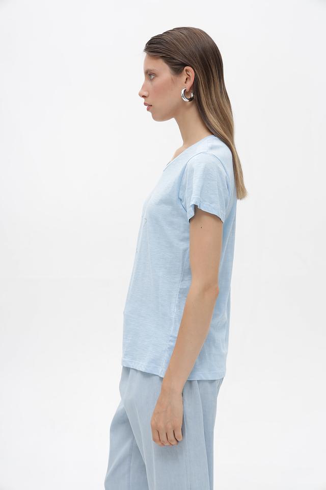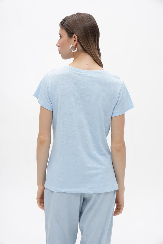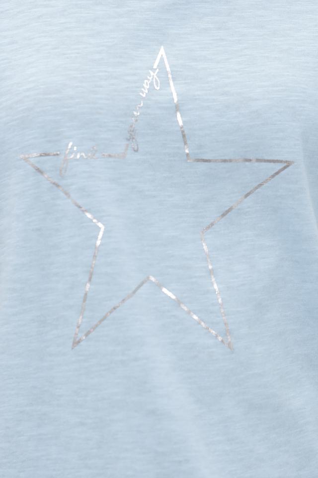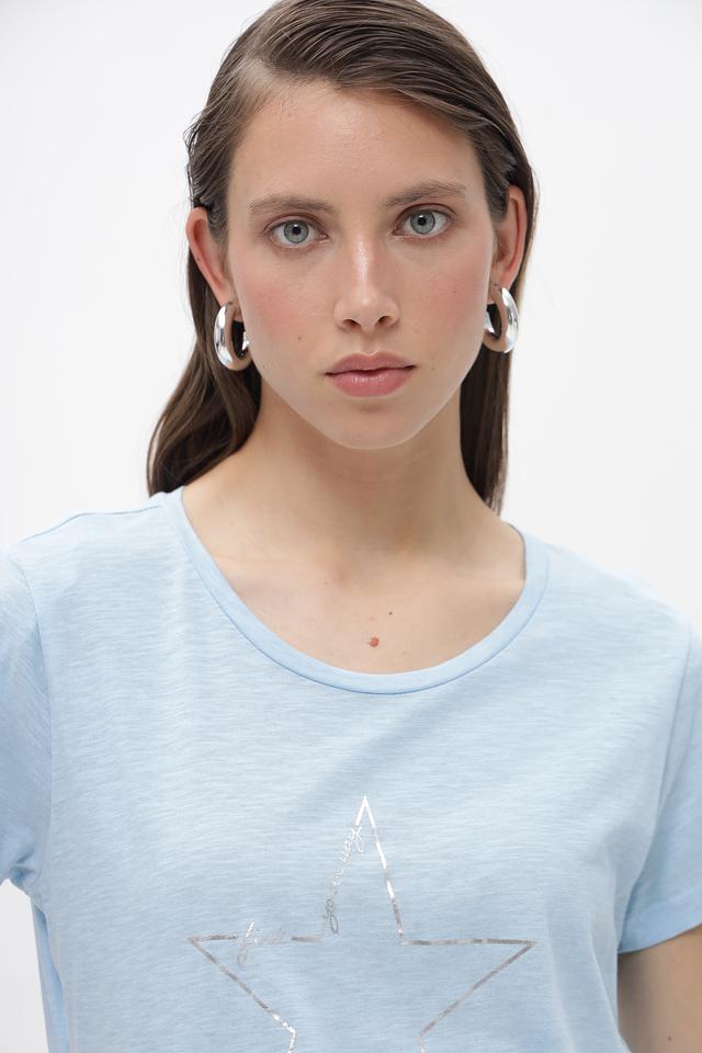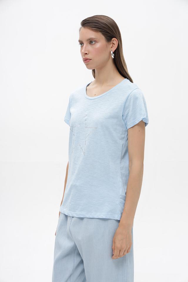 Основной цвет футболки — нежный голубой. На передней части изделия расположена декоративная звезда, выполненная в серебристом цвете, что придает ей особый шарм и привлекательность.