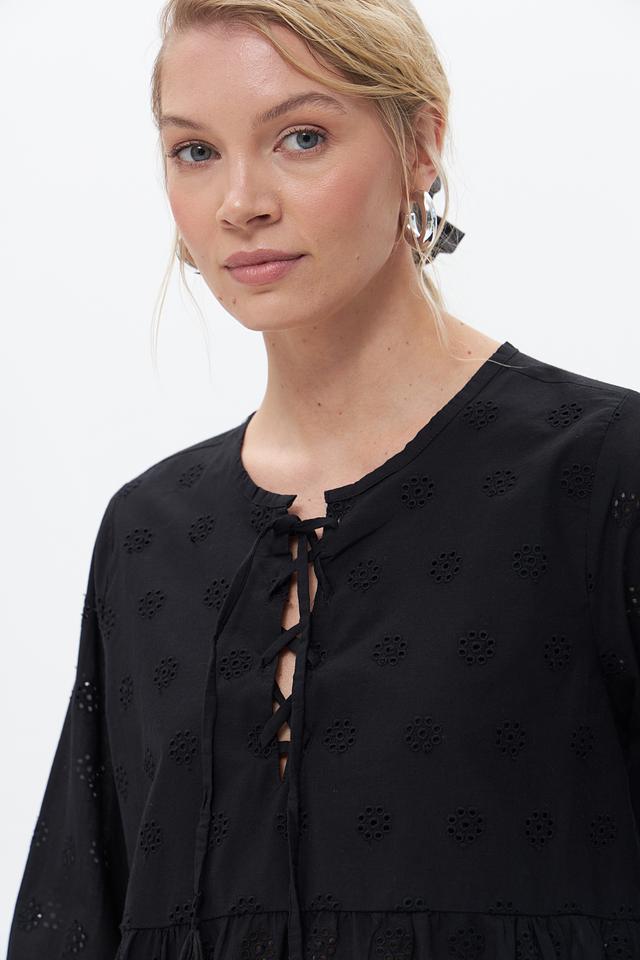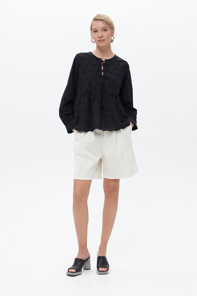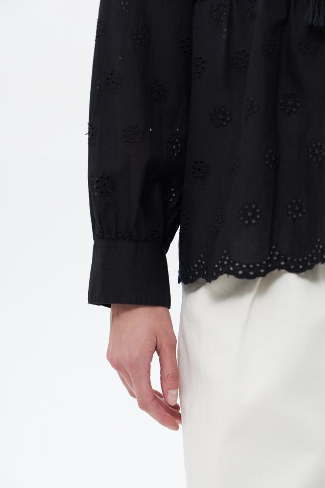 Чёрная блузка от Broadway выполнена из 100% хлопка и украшена объёмной вышивкой. Модель имеет свободный крой, рукава-фонарики и завязки с кистями на вырезе. Состав: хлопок 100%