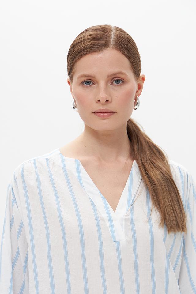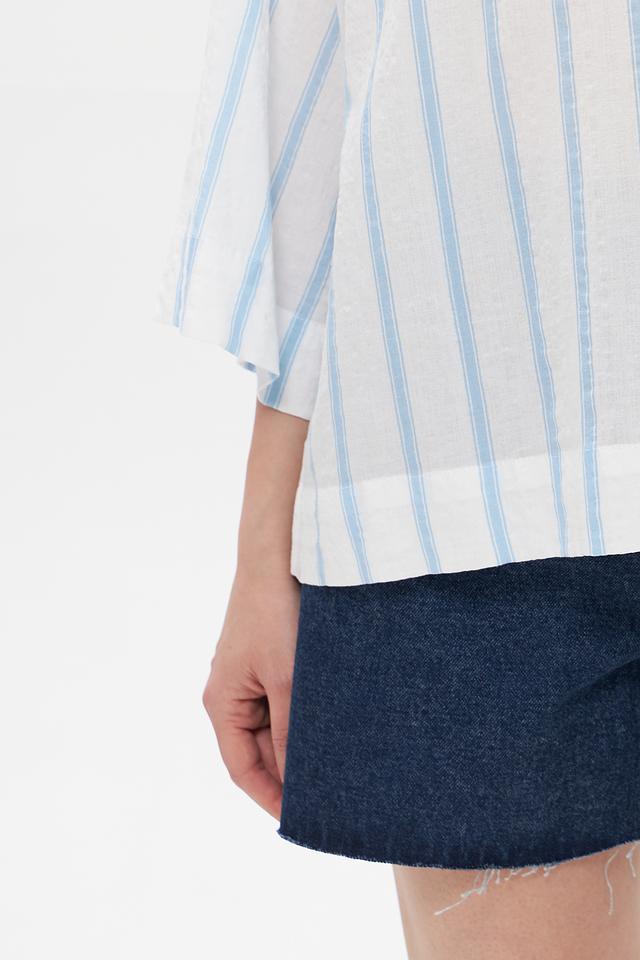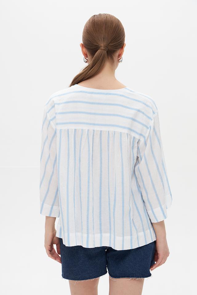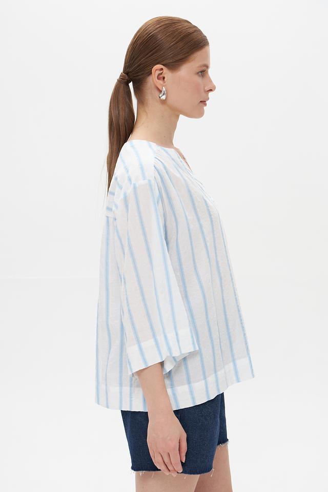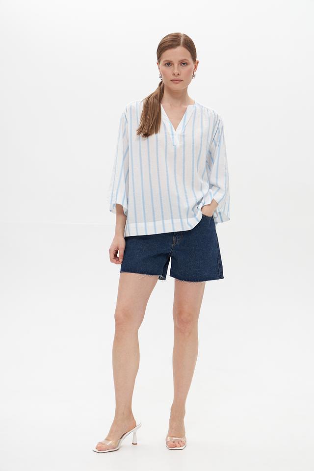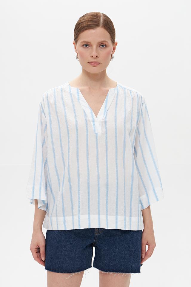 Вертикальная полоска голубого цвета на белом фоне делает эту блузу универсальной и подходящей для различных стилей. Она легко сочетается с джинсами, брюками или юбками.
