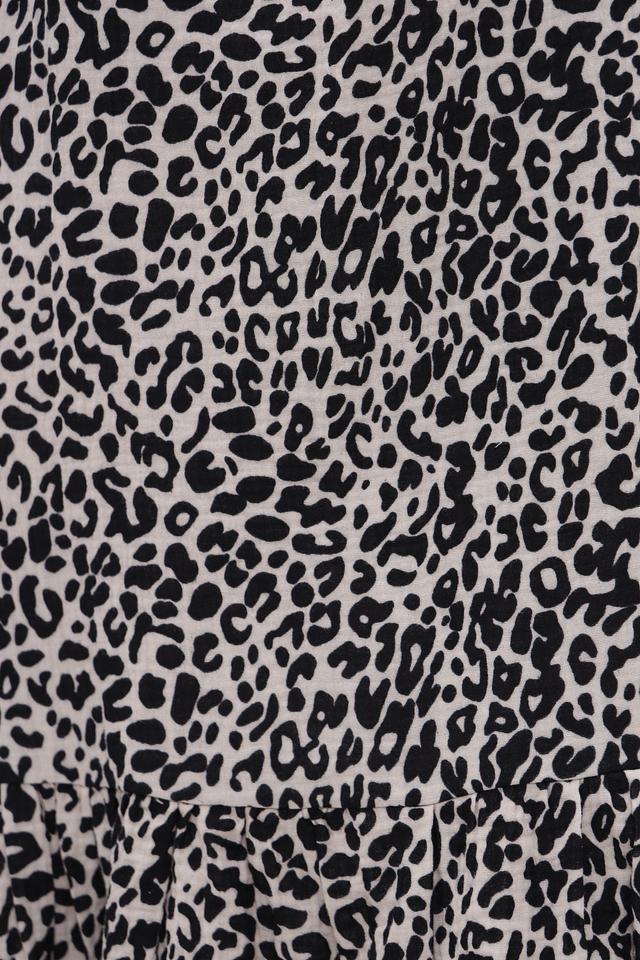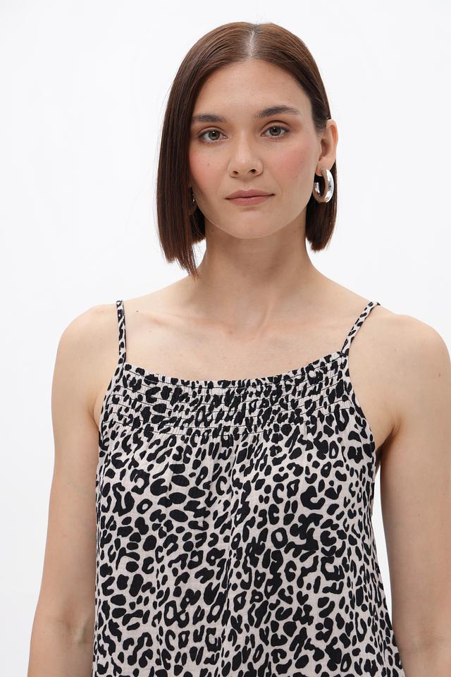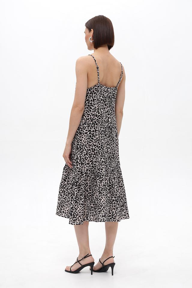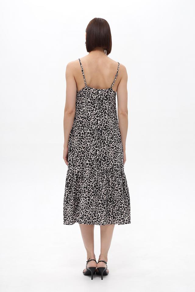 Платье украшено ярким леопардовым принтом, который придает ему оригинальность и привлекательность. Тонкие бретели и V-образный вырез подчеркивают линию плеч и шеи. Юбка в складку создает легкий и воздушный силуэт.