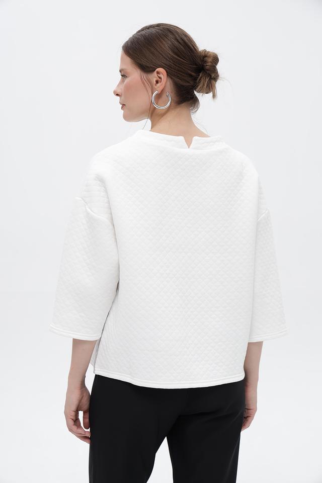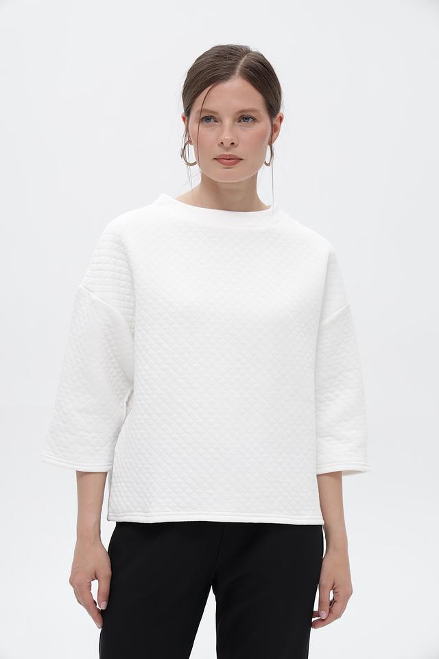 Этот стильный пуловер от Broadway выполнен в белом цвете и имеет оригинальную стеганую текстуру, придающую ему объём и фактурность. Модель с округлым вырезом горловины и рукавами 3/4 идеально подходит для создания повседневных образов.