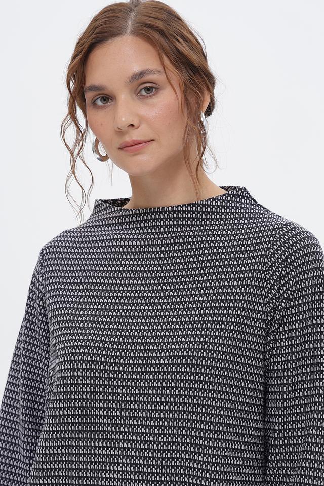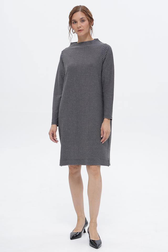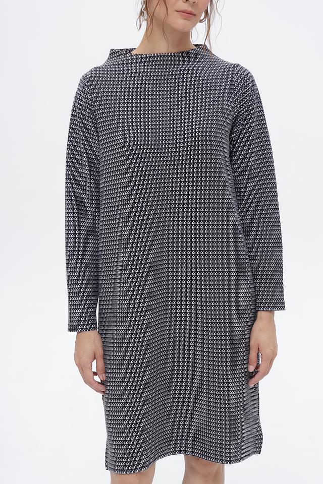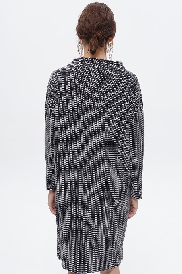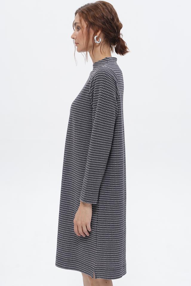 Платье от бренда Broadway выполнено из ткани с геометрическим принтом в серых тонах. Модель имеет прямой силуэт, длинные рукава и воротник-стойку.