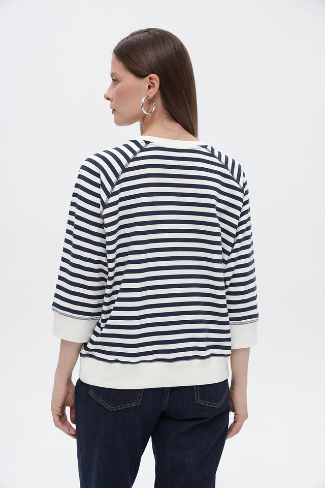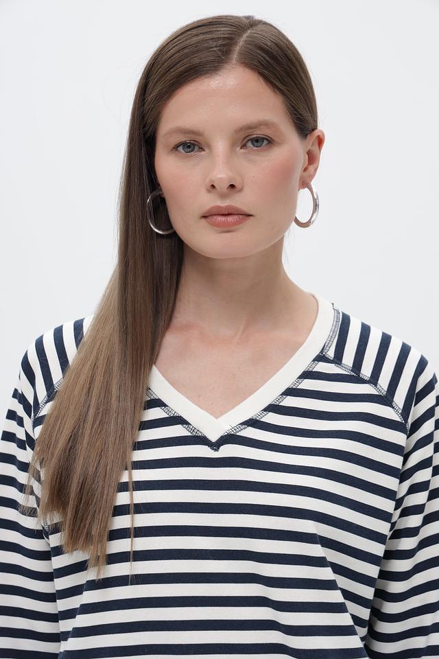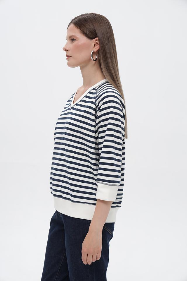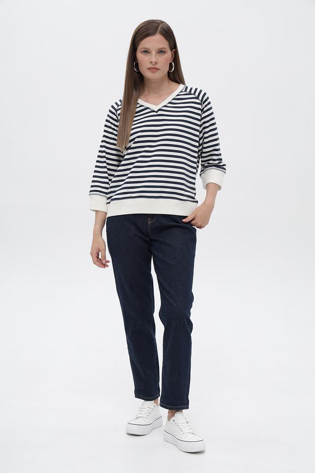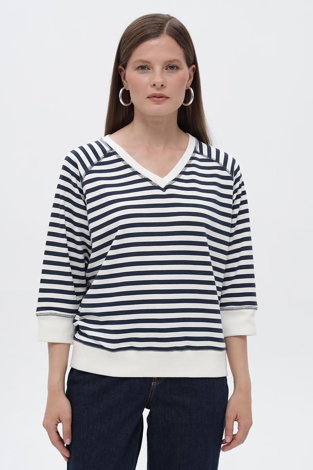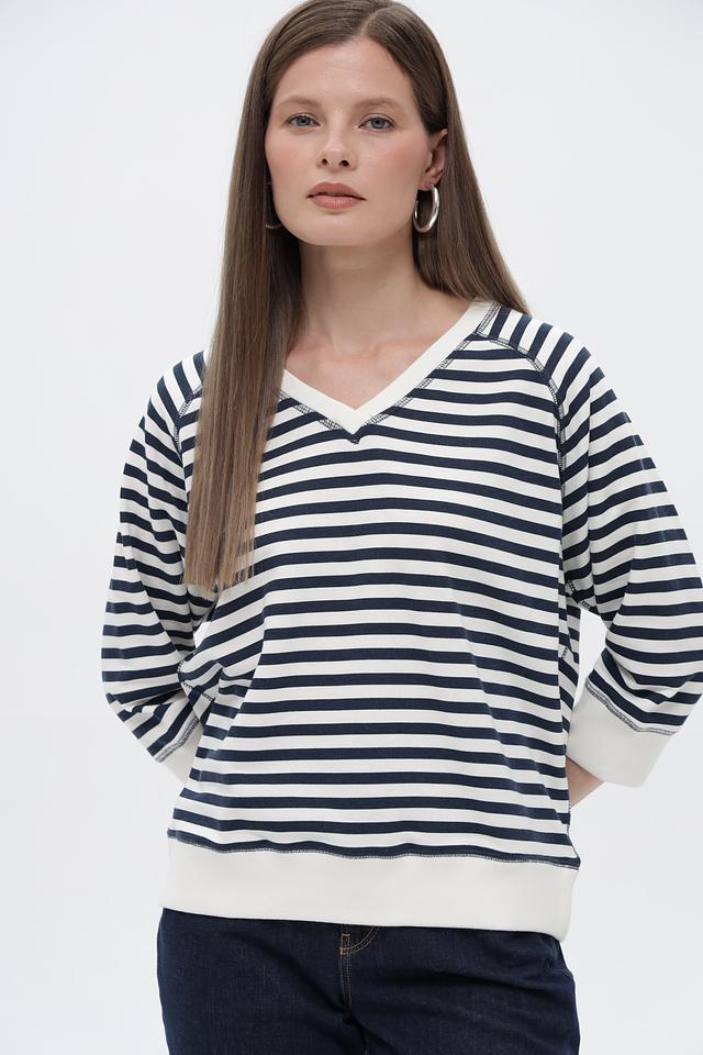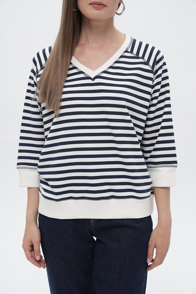 Женская футболка Broadway синего и белого цвета с полоской и V-образным вырезом. Изготовлена из мягкого хлопка с добавлением полиэстера для комфорта и долговечности. Стильный и универсальный вариант для повседневного образа. Состав: хлопок 60%, полиэстер 40%