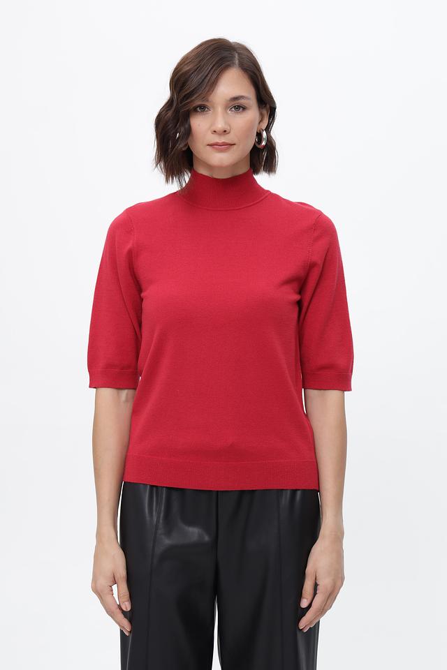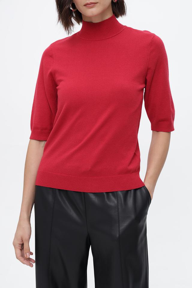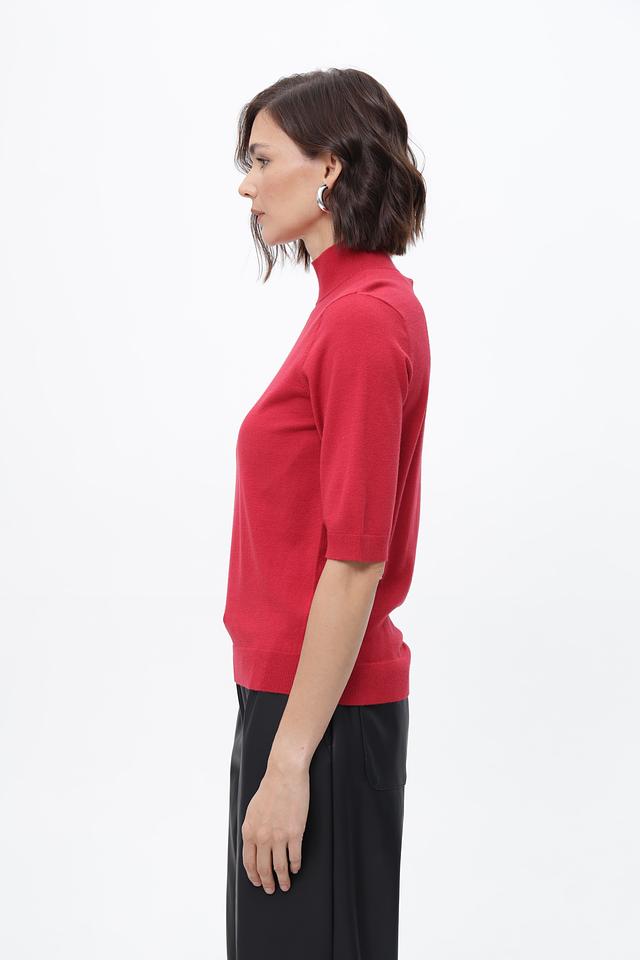 Пуловер имеет короткий рукав и высокий воротник, что придает ему элегантный и современный вид. Приталенный силуэт подчеркивает фигуру, а мягкий трикотаж обеспечивает комфорт в носке.