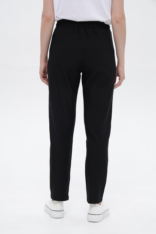 Брюки имеют прямой крой и эластичный пояс с регулирующими завязками, обеспечивающими комфортную посадку по фигуре. Ткань состоит из полиэстера (95%) и эластана (5%), что гарантирует приятные тактильные ощущения, износостойкость и небольшую эластичность.