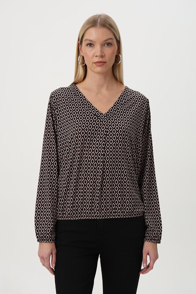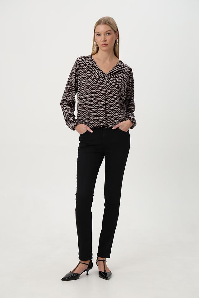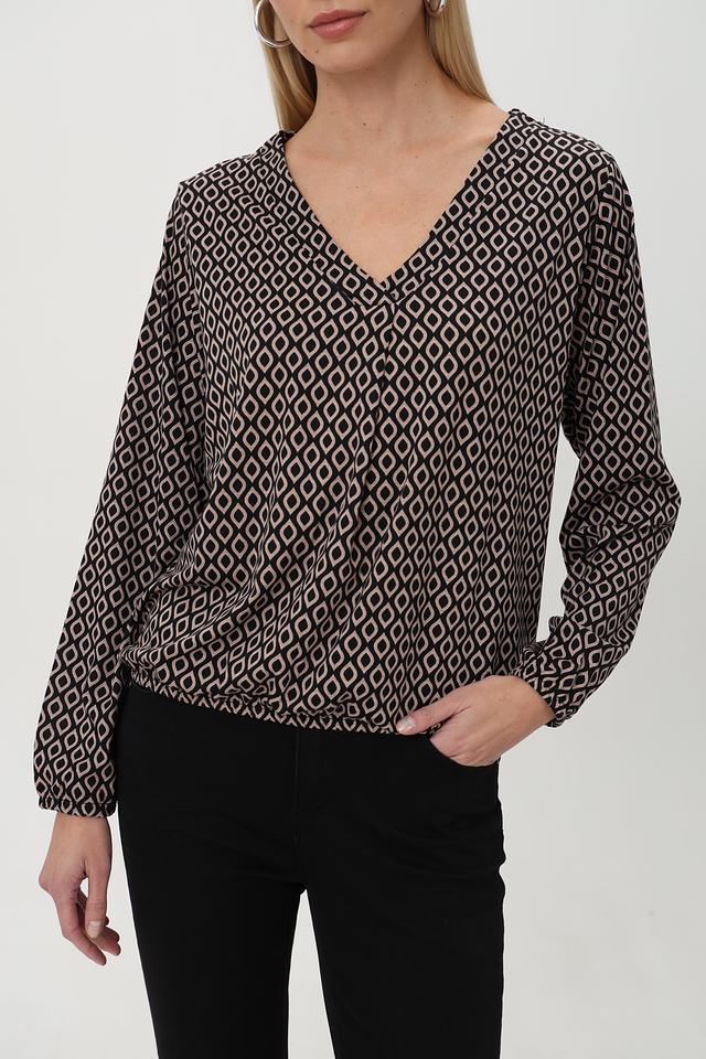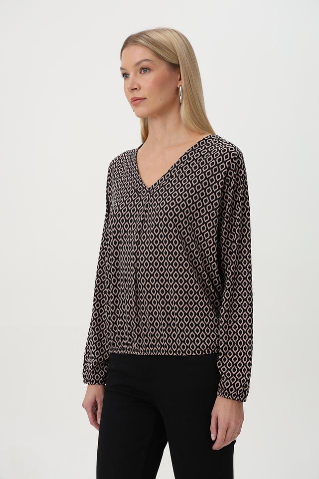 Блузка имеет классический V-образный вырез и длинные рукава с манжетами. Её особенностью является оригинальный геометрический принт в чёрно-белой гамме, который придаёт ей элегантный и современный вид.
