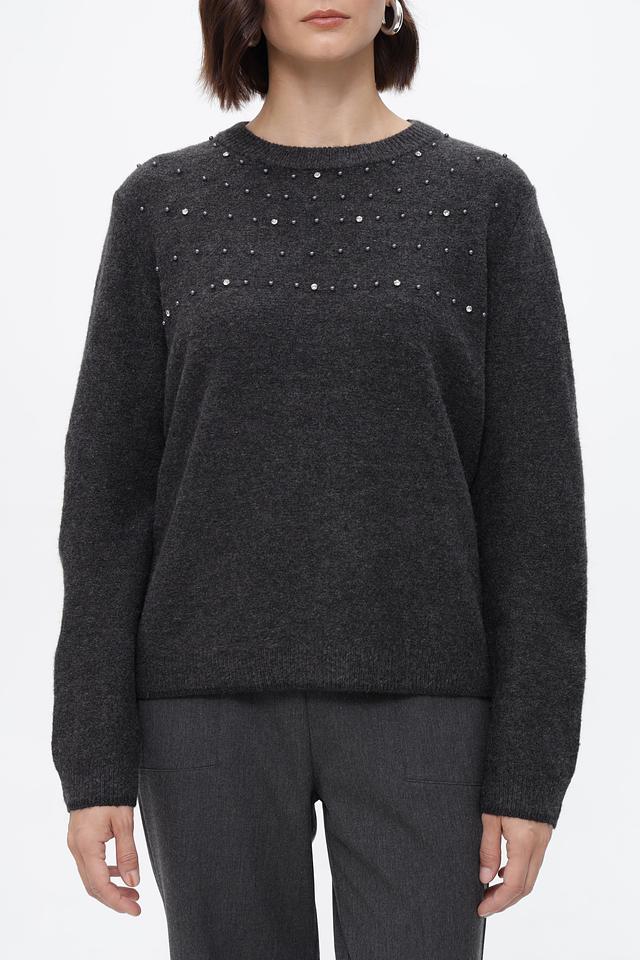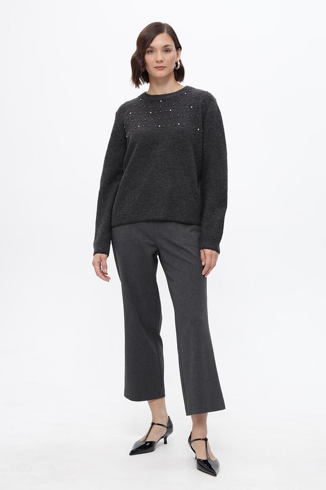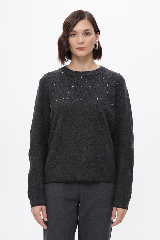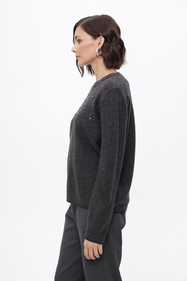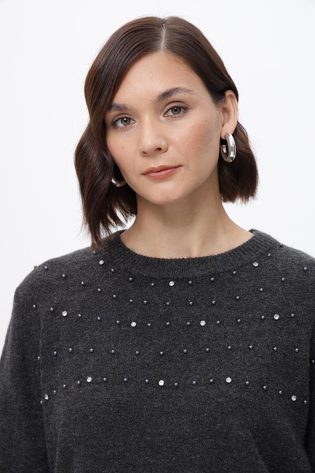 Особенностью данного пуловера является декор в виде бусин, которые придают ему изысканность и оригинальность. Пуловер изготовлен из высококачественных материалов: 80% полиэстер, 11% акрил, 6% шерсть и 3% спандекс. Такое сочетание обеспечивает комфорт в носке, сохранение формы и легкость ухода.