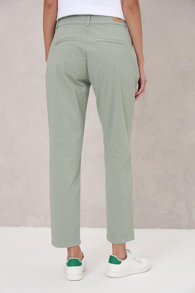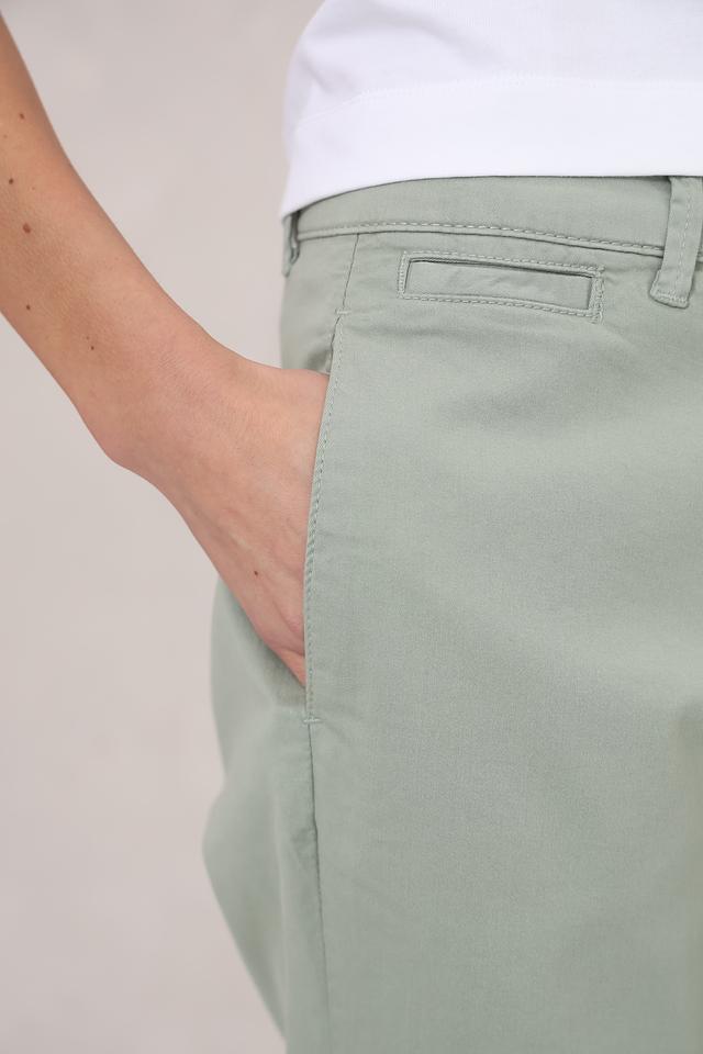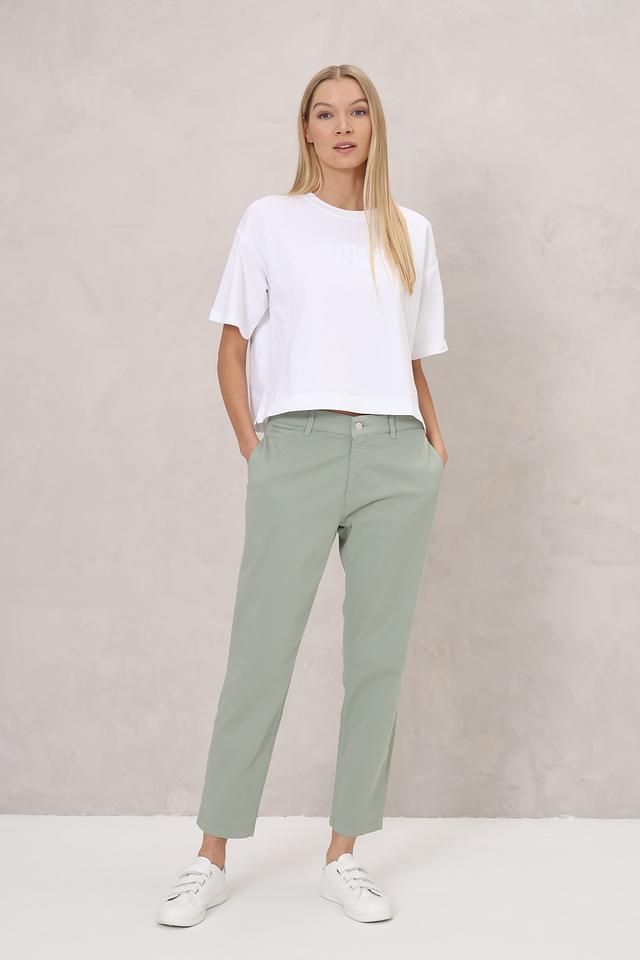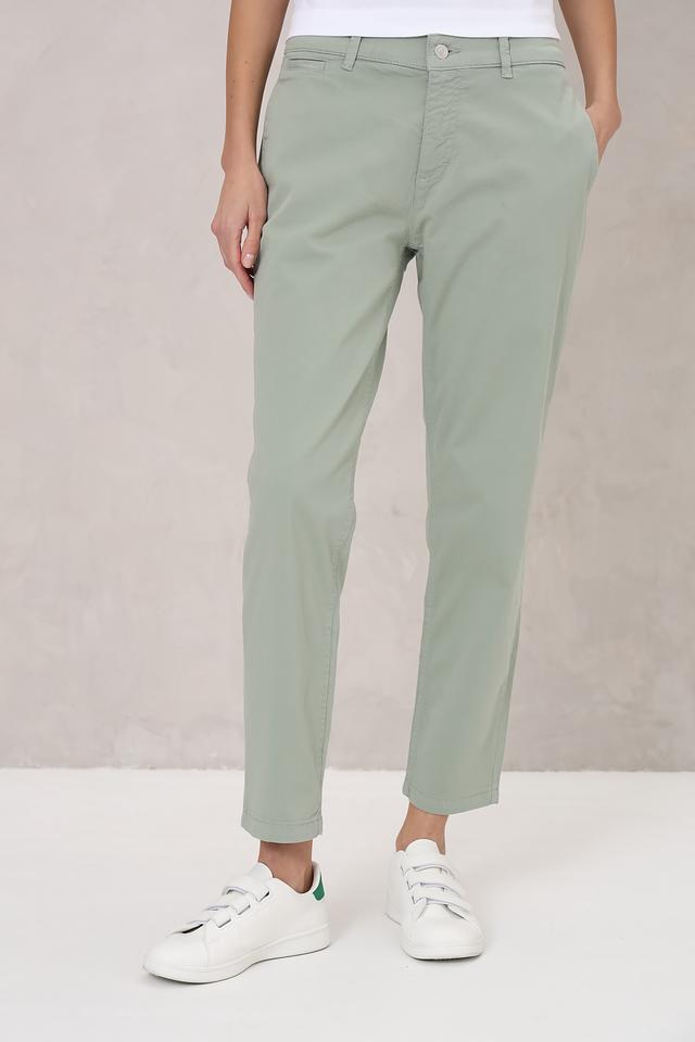 Нежный мятный цвет брюк легко сочетается с различными элементами одежды, позволяя создавать разнообразные образы — от повседневных до более элегантных. Состав ткани: 97% хлопок, 3% эластан.